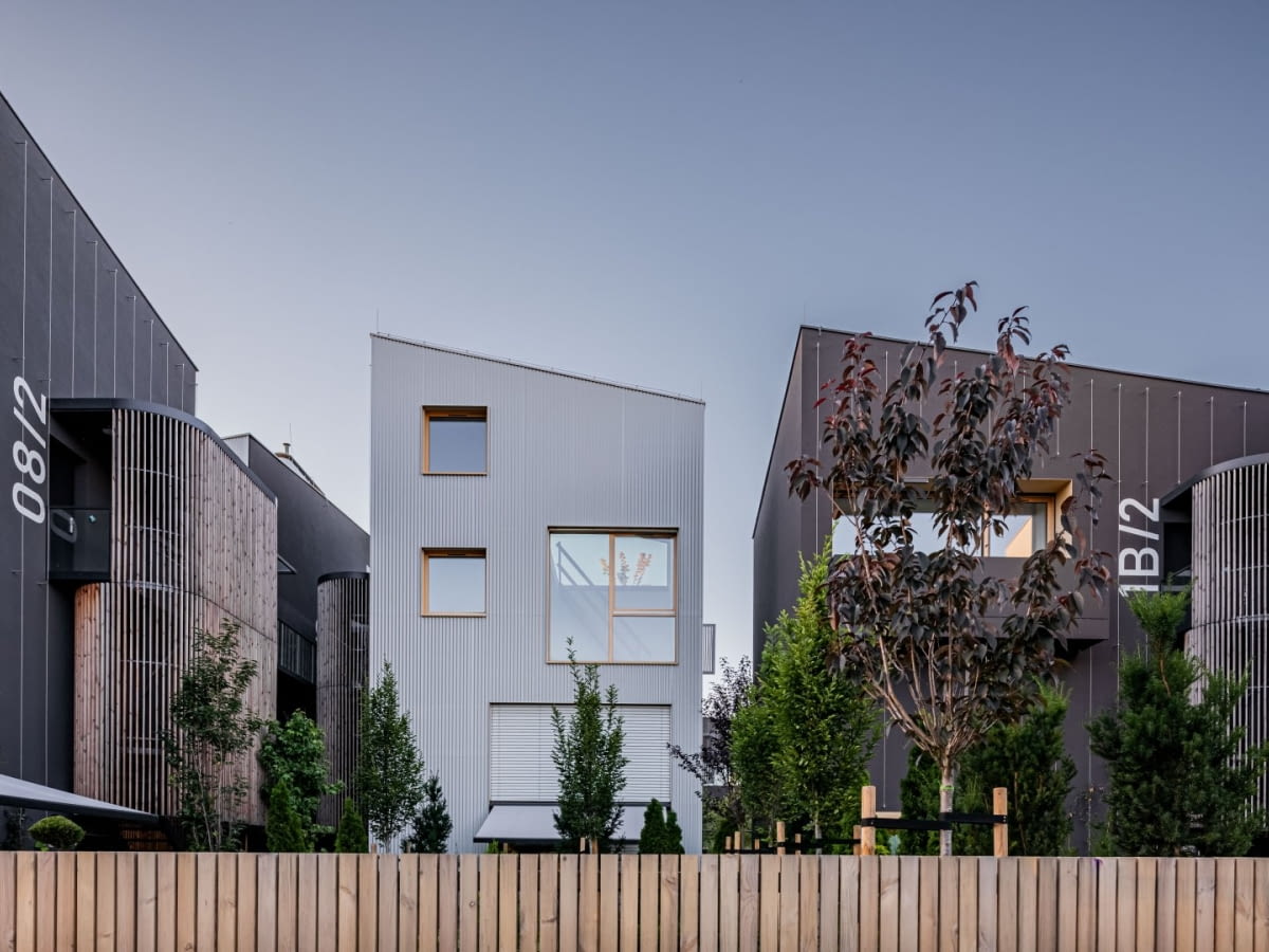 Architektura osiedla została oparta na zróżnicowaniu kształtów i elewacji. Falista i perforowana blacha podkreśla nowoczesny charakter zabudowy, natomiast drewno oraz tynk, uzupełnione pnącą się roślinnością, wprowadzają do niej naturalny akcent i harmonijnie łączą budynki z otoczeniem. Fasady zaprojektowano z dużą dbałością o proporcje, rytm podziałów oraz relację pomiędzy materiałami. Stonowana, naturalna kolorystyka nawiązuje do otaczającej zieleni, a różnorodność faktur i detali wzmacnia indywidualny charakter poszczególnych brył, nie zaburzając jednocześnie spójności całego zespołu.