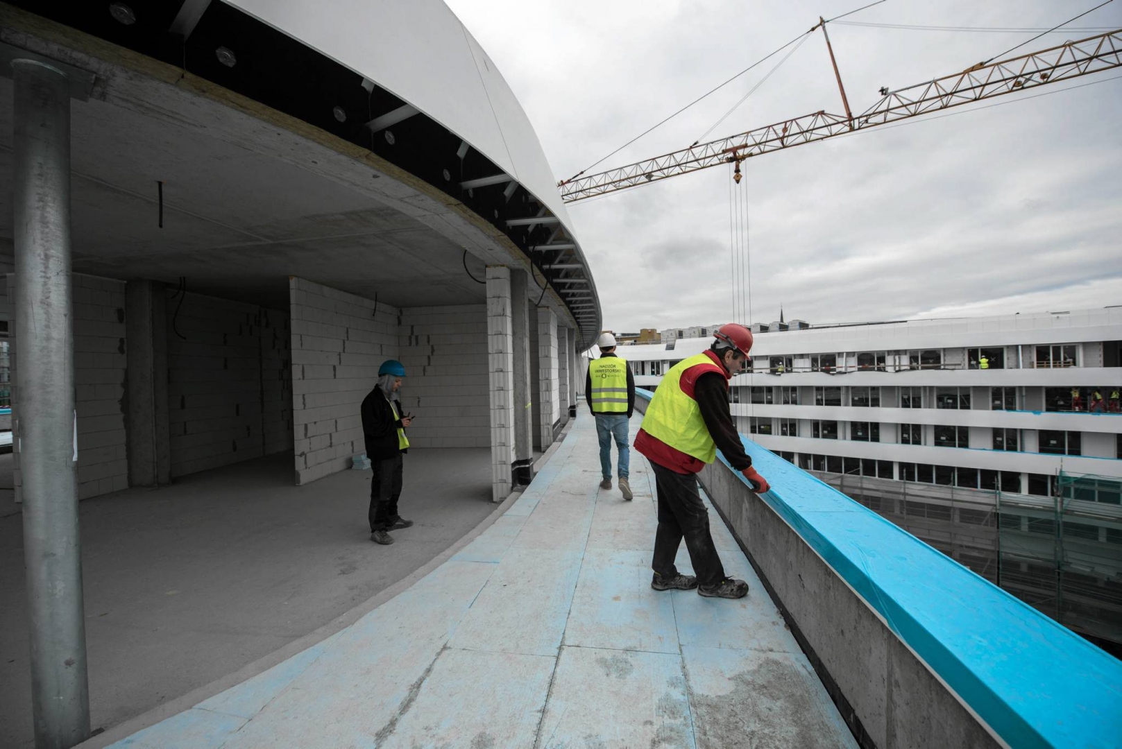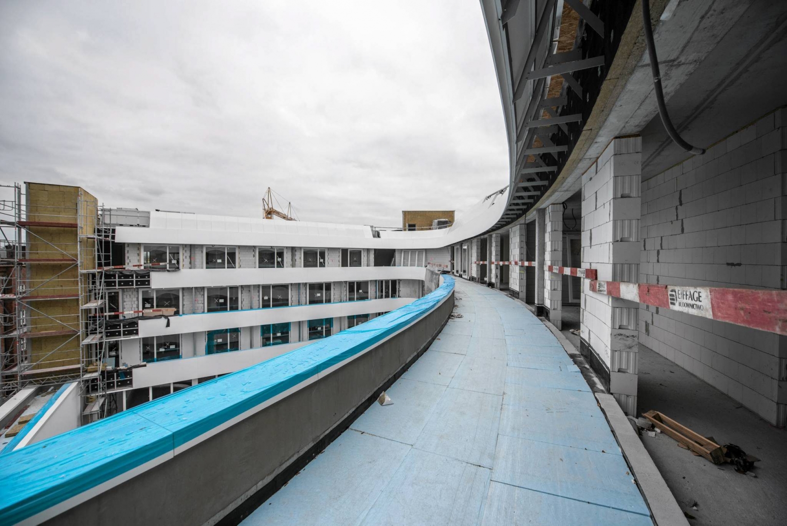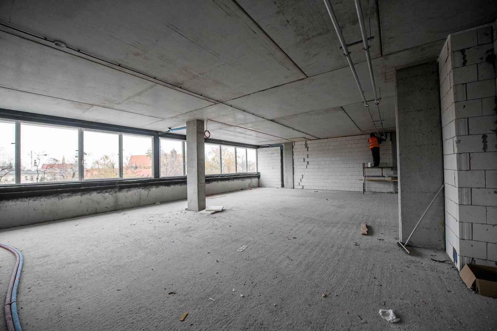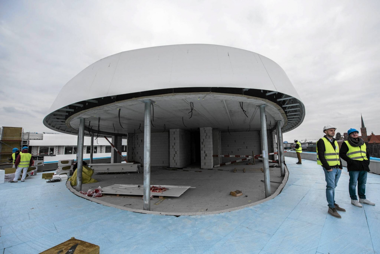 Wyżej znajdują się już tylko mieszkania. Od niedużych ok 25. metrowych do zajmujących najwyższe kondygnacje rozległych penthousów. Największy będzie miał powierzchnię 250 m kw., 200-metrowy taras i widok na Ostrów Tumski, Panoramę Racławicką i park Słowackiego. Drugi, 200 metrowy będzie za to mógł się pochwalić jeszcze większym 250. metrowym tarasem. W sumie w budynku powstanie 170 mieszkań. W mieszkaniach są już ściany wewnętrzne, pojawia się stolarka oraz instalacje.