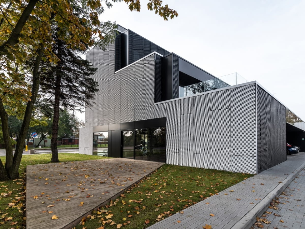 Nowoczesna, tarasowo ukształtowana bryła wpisuje się w kontekst architektoniczny zarówno swoimi gabarytami, jak i oszczędną formą złożoną ze schodkowo rozmieszczonych prostopadłościanów. W miejscach wcięć kolejnych kondygnacji powstały zielone tarasy. To przestrzeń, która może być wykorzystana do odpoczynku, jak i świetna sceneria do przeprowadzania wywiadów i realizowania nagrań poza zaprojektowanym we wnętrzu studiem. Starannie skomponowaną formę bryły podkreślają zastosowane kolory, biel perforowanych paneli frontowych i antracyt tylnej elewacji. Kompozycja kontrastowych barw, działa jak znak graficzny, określa awers i rewers projektowanego budynku.