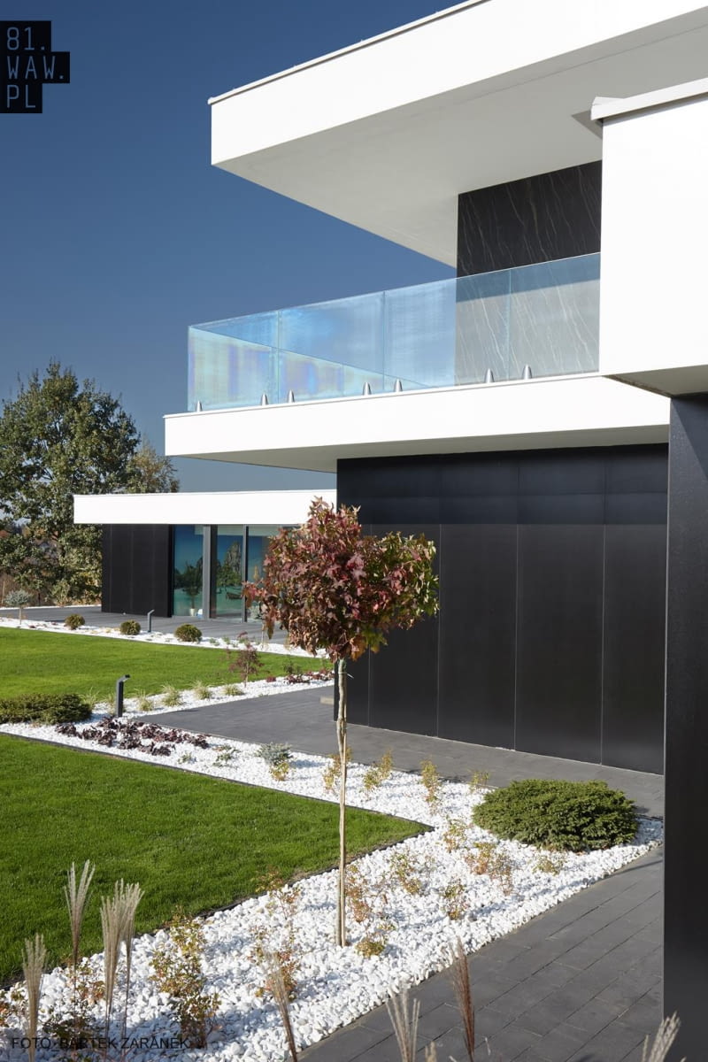 Jak opisują sami architekci: „Z zewnątrz budynek sprawia wrażenie modernistycznego pawilonu. Główna część została podkreślona wielkoformatowymi płytami ze spieka kwarcowego z charakterystycznymi żyłami, który jest podzielony horyzontalnymi liniami białych stropów. Kształt dachu odzwierciedla kształt tarasu. Parter został wykończony czarnym, jednolitym spiekiem, który nie stanowi konkurencji dla piętra, a jeszcze bardziej łączy budynek z gruntem”. Stonowane, biało – czarne elewacje doskonale współgrają ze skromną, czytelną w swojej prostocie bryłą domu.