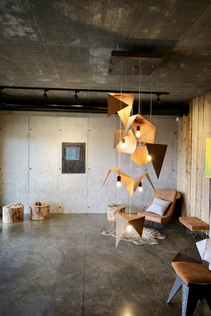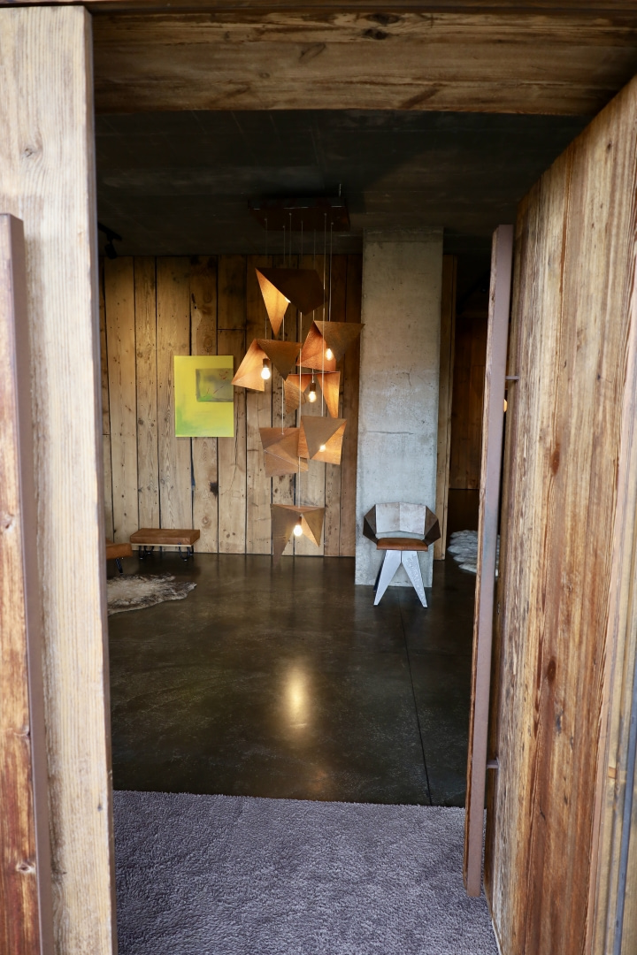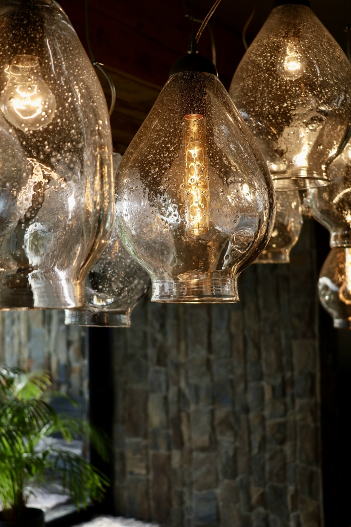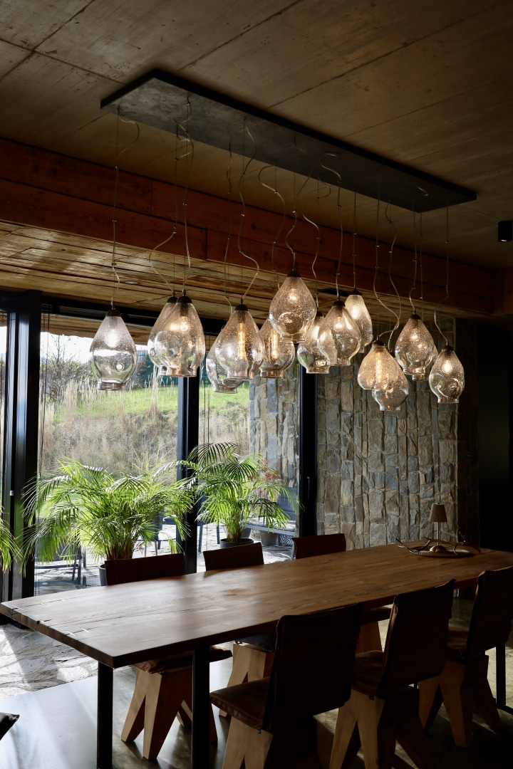 Integralną częścią architektury stało się światło. W strefie wejścia zawisły trzy żyrandole z serii BIRDS od Gie El o rdzawym wykończeniu, które niczym rzeźby wyznaczają pierwszy punkt odniesienia i wprowadzają do surowego wnętrza ciepłe światło. W salonie, nad dużym drewnianym stołem, pojawił się stworzony przez Gie El żyrandol z serii BUBBLES – z ręcznie formowanymi kloszami, w których zatopione zostały pęcherzyki powietrza. Organiczne formy kloszy wprowadzają do wnętrza lekkość i miękkość, a pęcherzyki multiplikują refleksy światła, tworząc setki drobnych, złotych punktów. Dzięki temu światło zmienia się w zależności od pory dnia i roku, a sam żyrandol wchodzi w dialog z krajobrazem za oknem.