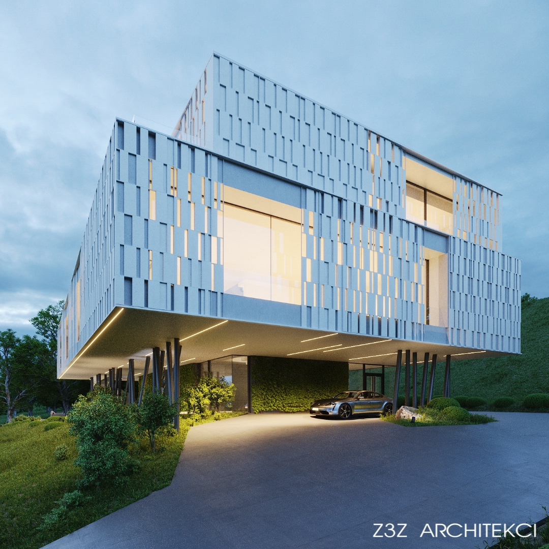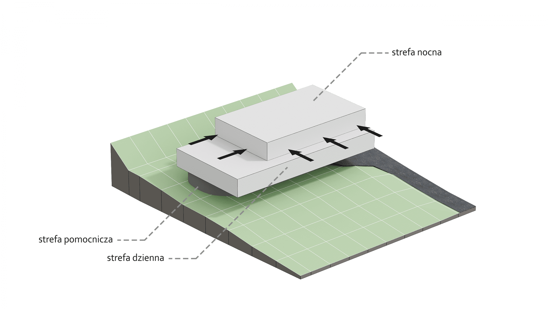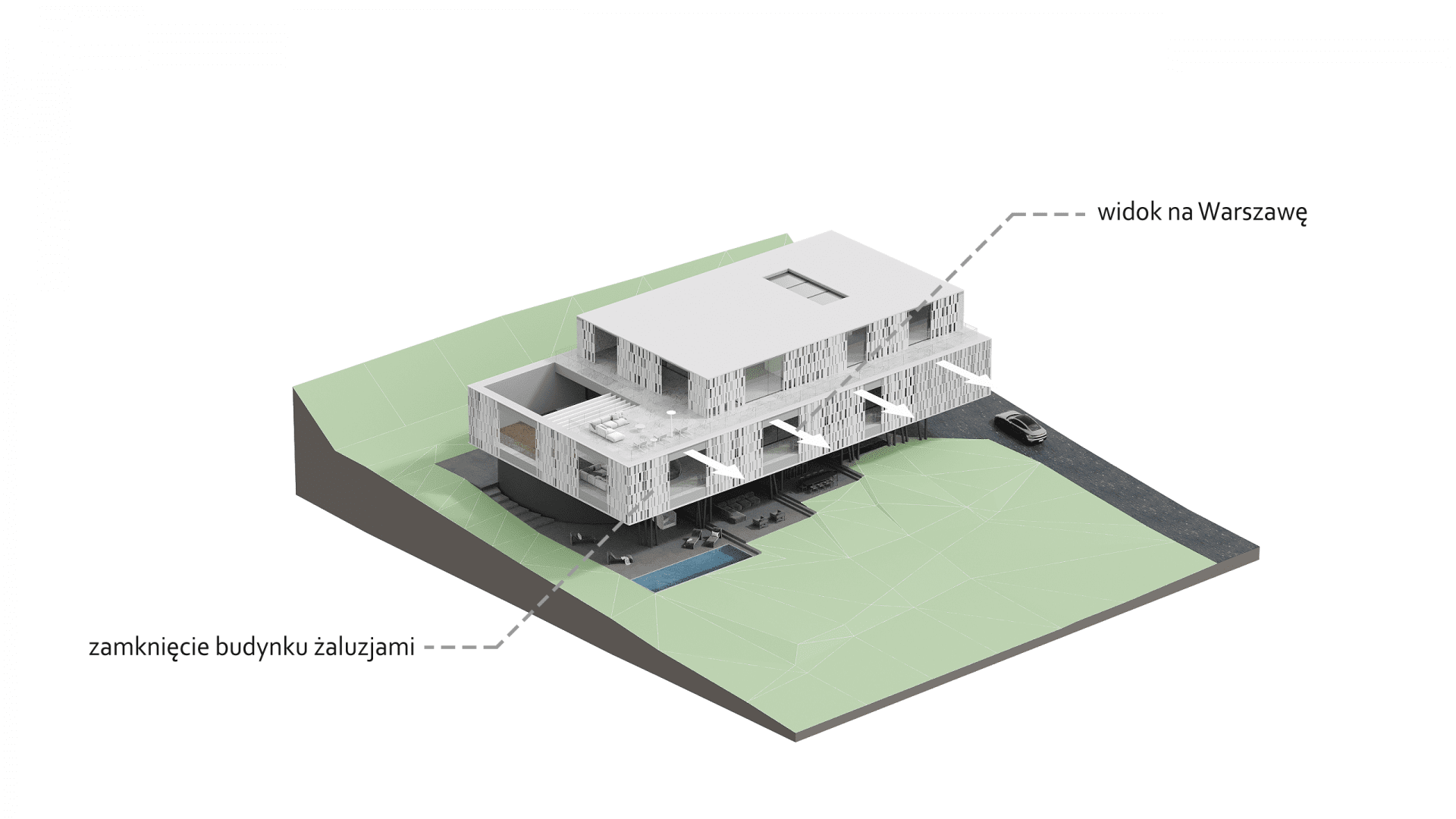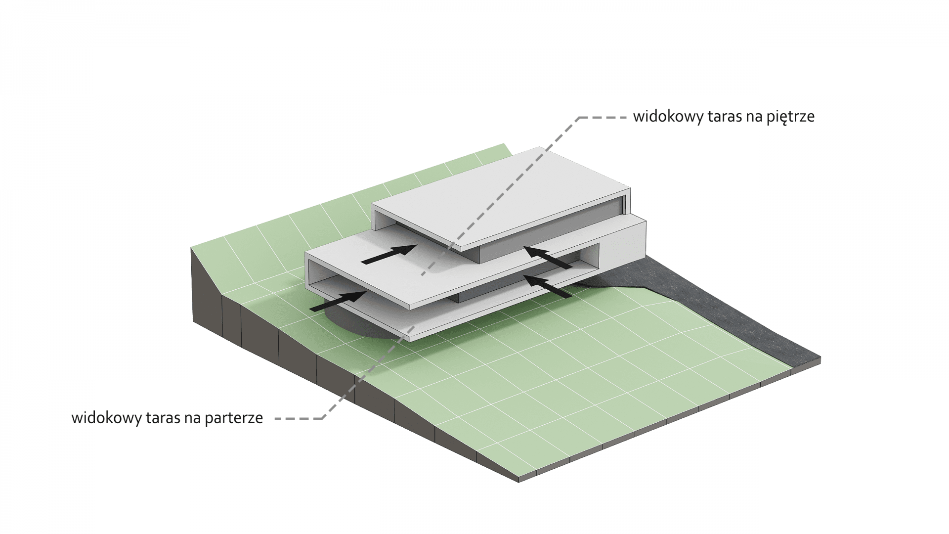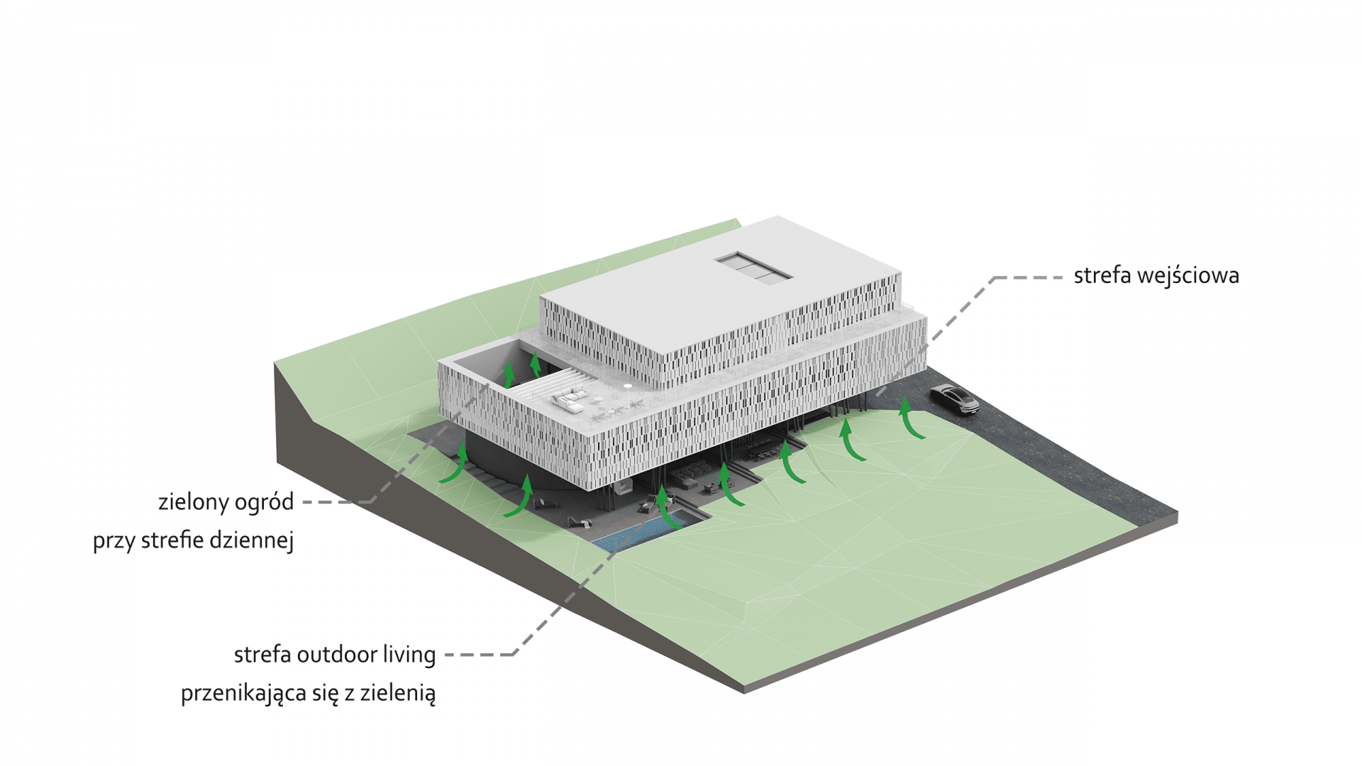 Z tego względu projektanci zdecydowali się na nietypowy dla domów jednorodzinnych układ funkcji oraz kształt bryły. Parter przeznaczono na reprezentacyjny hol wejściowy, garaż mieszczący cztery samochody oraz pomieszczenia pomocnicze. Część tej kondygnacji została otwarta i przekształcona w podcienia z tarasami mieszkalnymi w duchu idei „outdoor living”. Przed wejściem zaplanowano zadaszony podjazd, umożliwiający wygodne przejście z samochodu – także podczas deszczu. Tarasy na poziomie parteru mają bezpośredni kontakt z zielenią, przenikają się z wnętrzem budynku i zostały ułożone kaskadowo, tak aby podążać za naturalnym ukształtowaniem terenu i minimalnie ingerować w grunt.