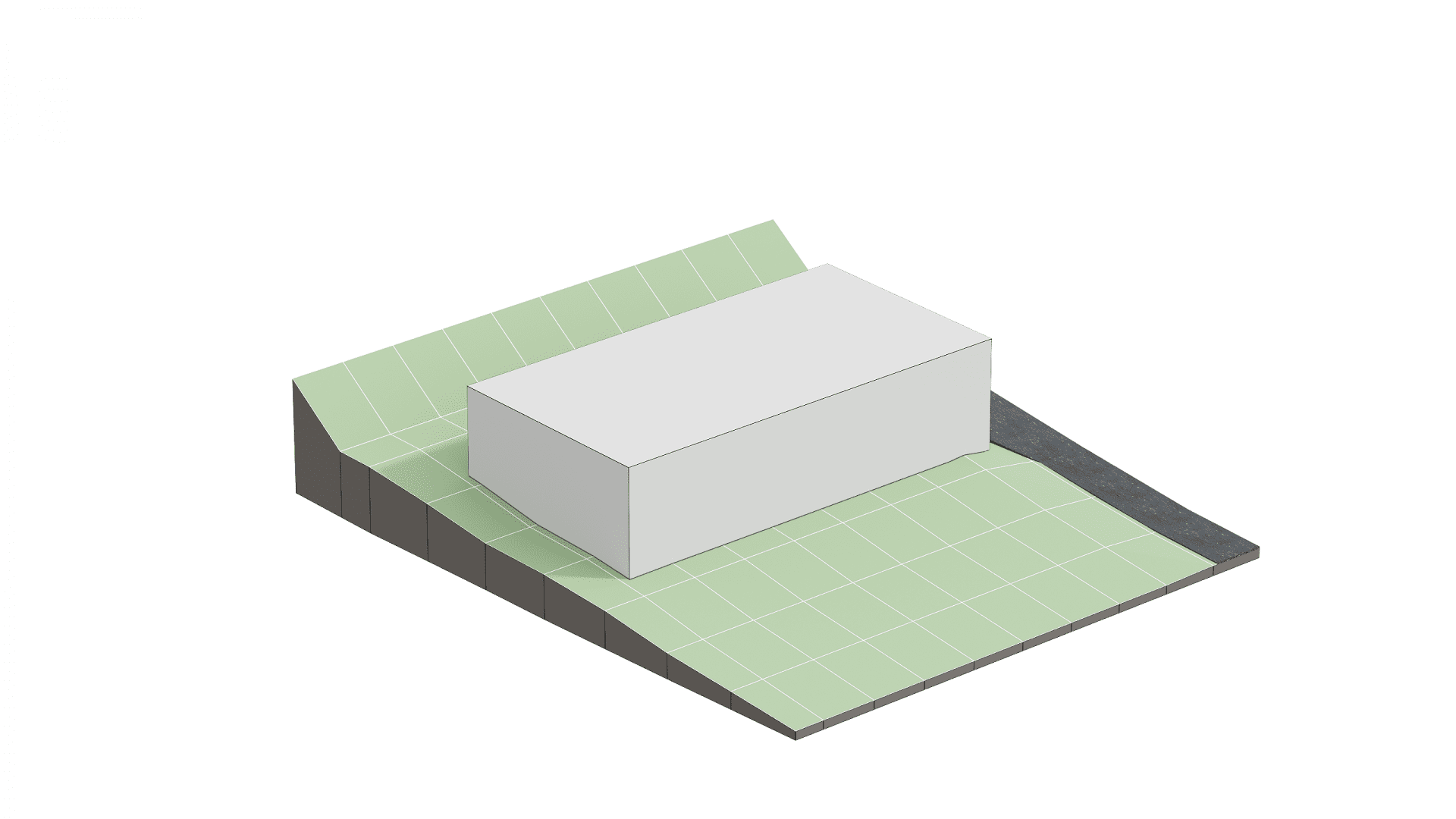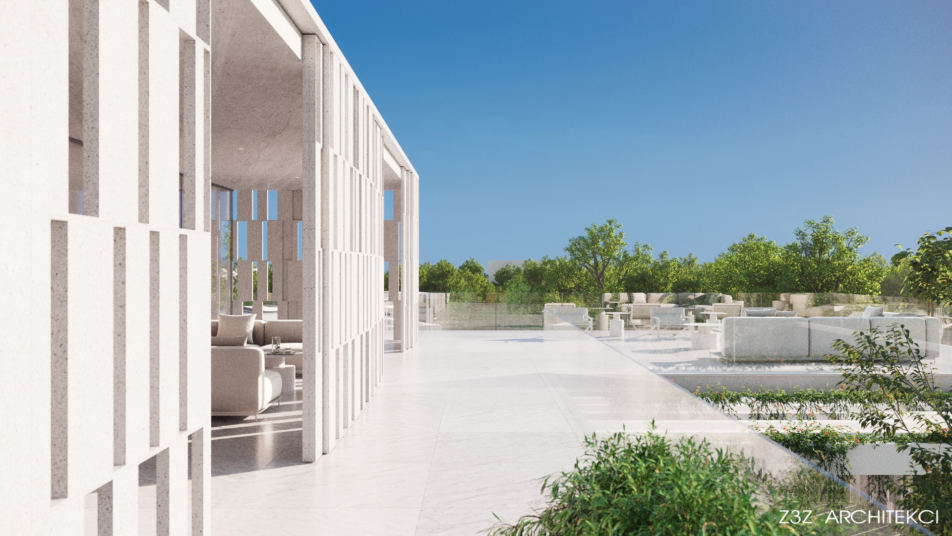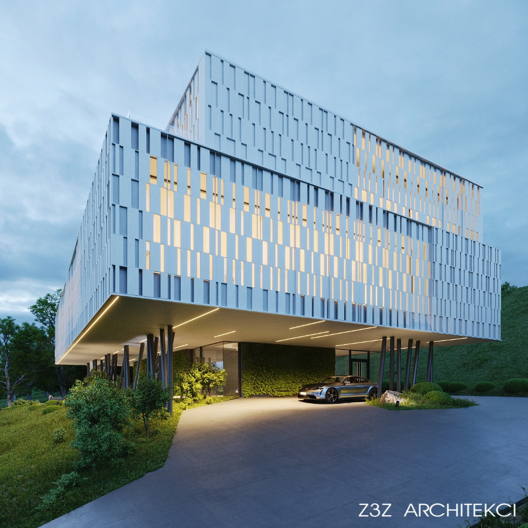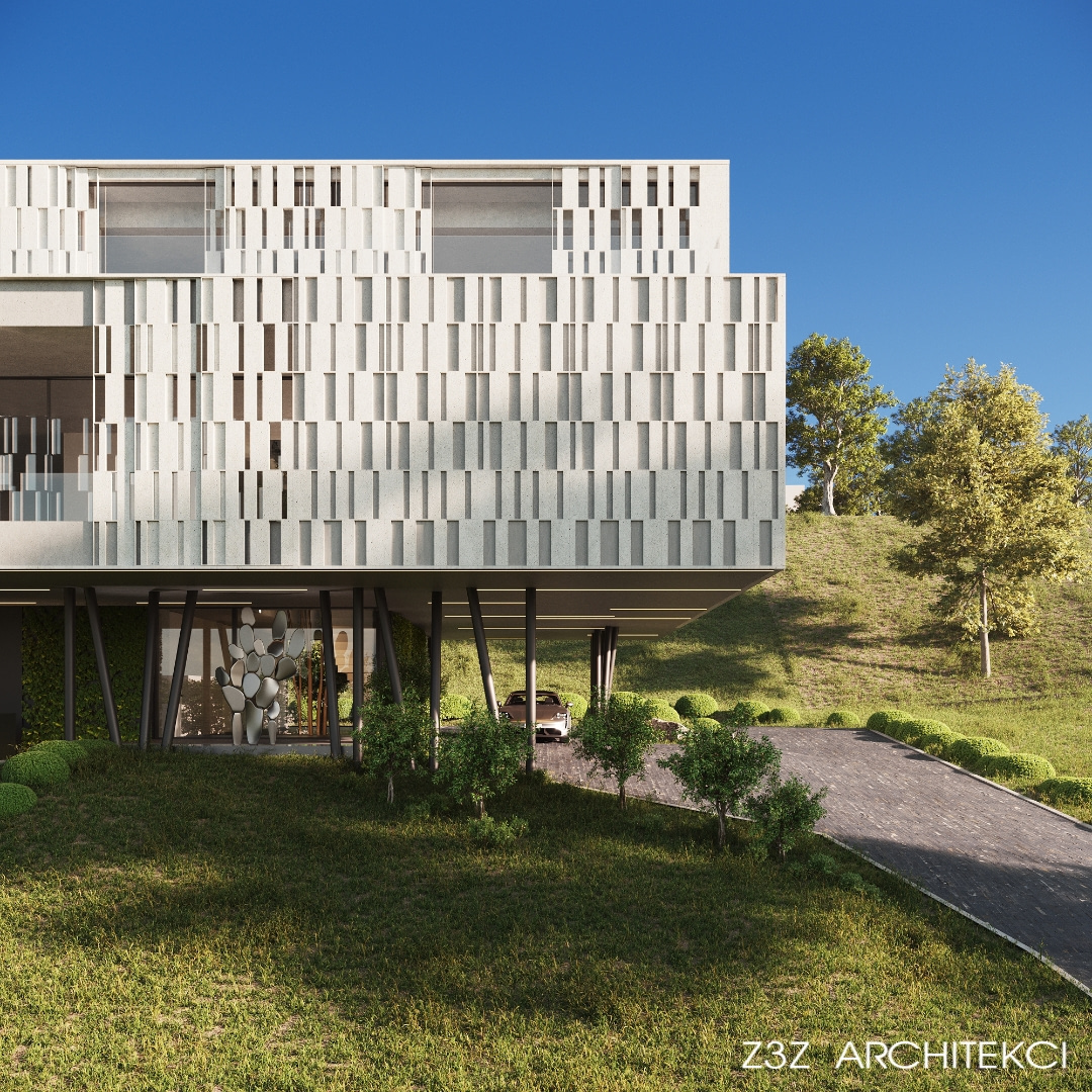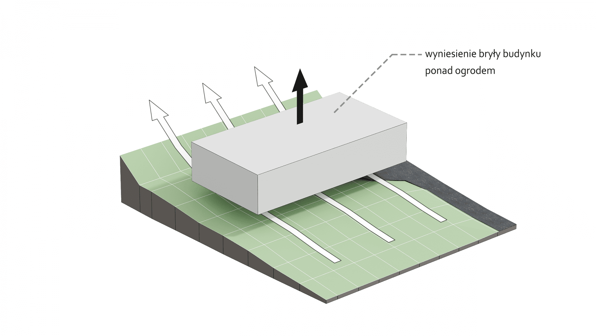 Z tego względu projektanci zdecydowali się na nietypowy dla domów jednorodzinnych układ funkcji oraz kształt bryły. Parter przeznaczono na reprezentacyjny hol wejściowy, garaż mieszczący cztery samochody oraz pomieszczenia pomocnicze. Część tej kondygnacji została otwarta i przekształcona w podcienia z tarasami mieszkalnymi w duchu idei „outdoor living”. Przed wejściem zaplanowano zadaszony podjazd, umożliwiający wygodne przejście z samochodu – także podczas deszczu. Tarasy na poziomie parteru mają bezpośredni kontakt z zielenią, przenikają się z wnętrzem budynku i zostały ułożone kaskadowo, tak aby podążać za naturalnym ukształtowaniem terenu i minimalnie ingerować w grunt.