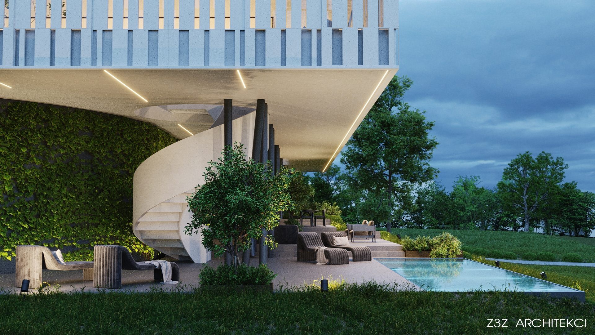 Strefę dzienną umieszczono na pierwszym piętrze. To tutaj znajdują się salon, kuchnia, jadalnia oraz przestronne tarasy, a także część rekreacyjna obejmująca basen, siłownię i pokój kinowy. Drugie piętro pełni funkcję strefy nocnej, z sypialniami oraz gabinetem. Z tego poziomu rozpościera się niezakłócony widok na panoramę Warszawy. Od strony wschodniej i południowej, na obu kondygnacjach, zaprojektowano obszerne tarasy otwierające dom na miasto. Taras połączony ze strefą dzienną i rekreacyjną łączy się z tarasami na gruncie dzięki spiralnym, białym schodom, które stanowią charakterystyczny element spajający wszystkie części budynku.