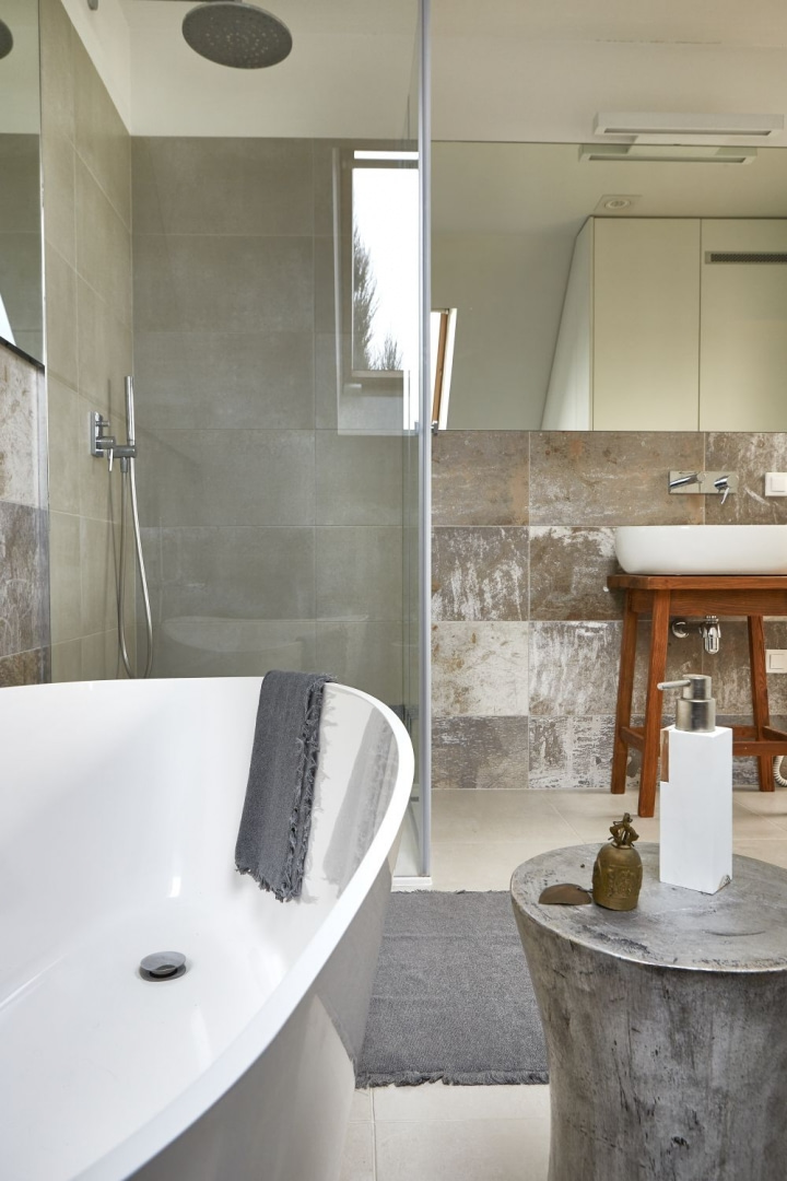 Aż trudno uwierzyć, że łazienka przed remontem była w pomarańczowo-zielonych kolorach. Teraz, spójne z wystrojem całego domu pomieszczenie, zachwyca materiałami wykończeniowymi. Na uwagę zasługują wspaniałe, imitujące brązowy kamień płytki gresowe marki Aparici.