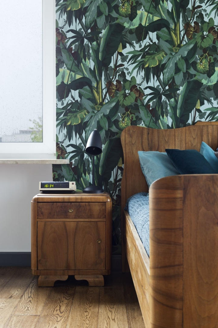 Na piętrze mieszczą się trzy sypialnie oraz łazienka. Jako, że dom leży w otoczeniu zieleni, a sama natura jest dla właścicieli bardzo ważna, projektanci postanowili wciągnąć ją do wnętrza. Powstał pomysł wykończenia ściany u wezgłowia łóżka tapetą z motywem liści bananowca. Nowoczesny sposób dekoracji ściany jest przeciwieństwem łóżka i towarzyszących mu nocnych szafek, z których korzystały jeszcze dwa poprzednie pokolenia.