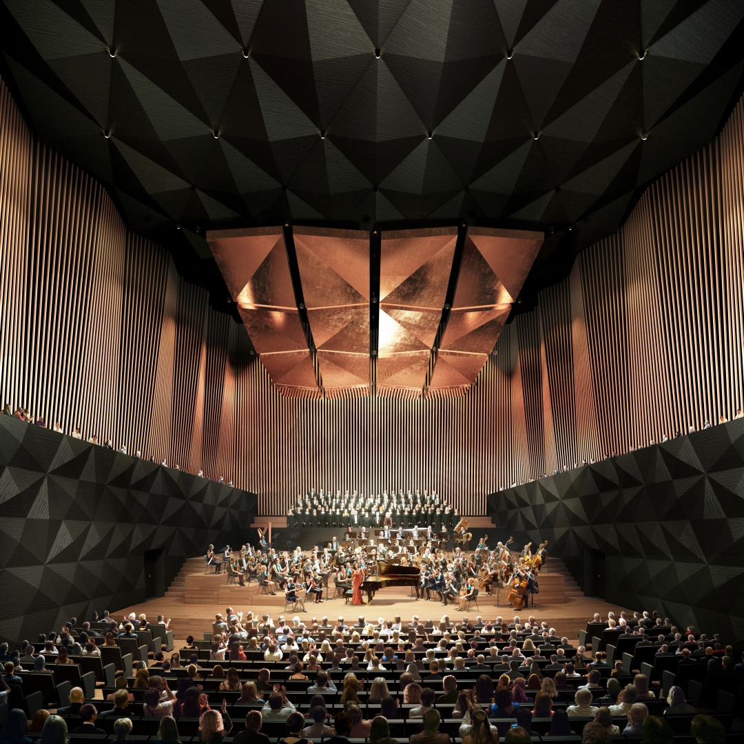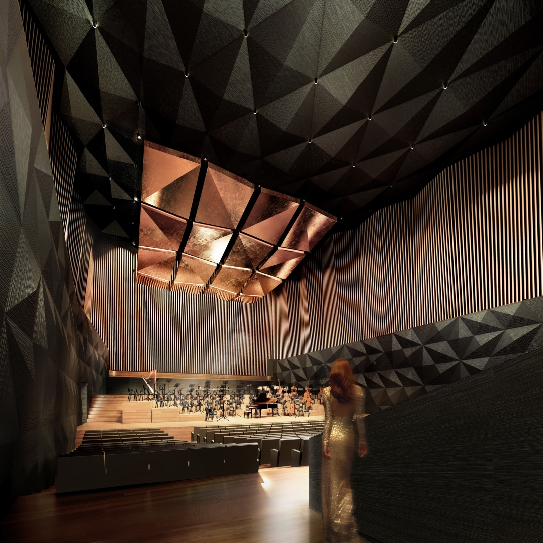 Dwie sale koncertowe dostarczą odmiennych doświadczeń muzycznych. Mniejsza, kameralna, to elastyczna przestrzeń dla koncertów, spektakli i artystycznych performance’ów. Główna jest sercem budynku, podporządkowanym dźwiękowi, symfoniom i utworom, które wypełnią ją od pierwszego do ostatniego rzędu.