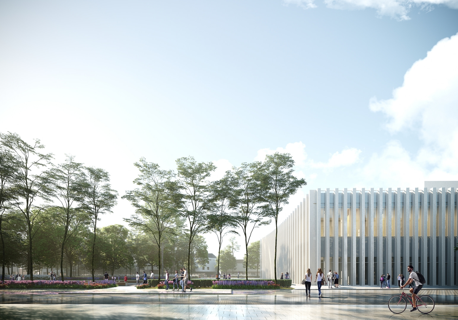 Południowy plac działa jak pauza w miejskim rytmie. Płynnie łączy się z nowym parkiem - miejscem odpoczynku i plenerowych wydarzeń. Latem drzewa dają cień i chłód, zimą wprowadzają kojącą ciszę, tłumiąc dźwięki miasta. Fasada filharmonii subtelnie wycofuje się na drugi plan, pozwalając naturze grać pierwsze skrzypce.