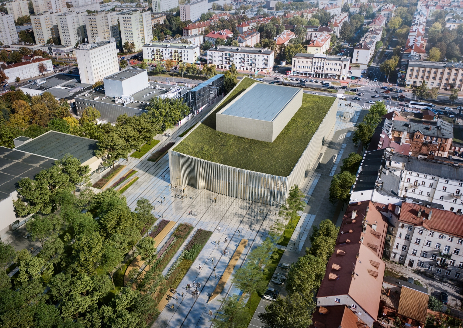 Cofnięcie bryły filharmonii wobec ważnej osi komunikacyjnej miasta - alei Jachowicza, dało oddech w postaci nowego, miejskiego placu. Przestrzeń ta służyć ma wspólnym działaniom obu instytucji: letnim wernisażom, happeningom czy paradom teatrów ulicznych. Ten układ porządkuje Nowy Rynek i zaprasza do spaceru prowadzącego w stronę Wisły.