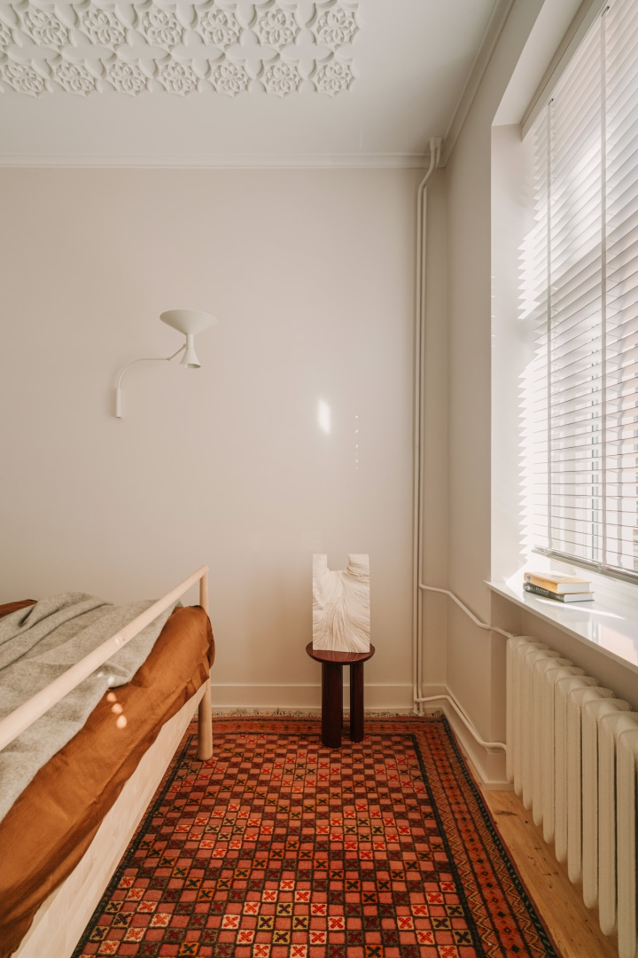 Mieszkanie o powierzchni 60 m² mieści się w historycznej łódzkiej kamienicy. Punktem wyjścia dla projektu była sama struktura budynku – wysokie stropy, duże przeszklenia i klasyczne detale architektoniczne. Usunięcie wtórnych podziałów i zbędnych elementów pozwoliło przywrócić wnętrzu jego pierwotną logikę i proporcje.