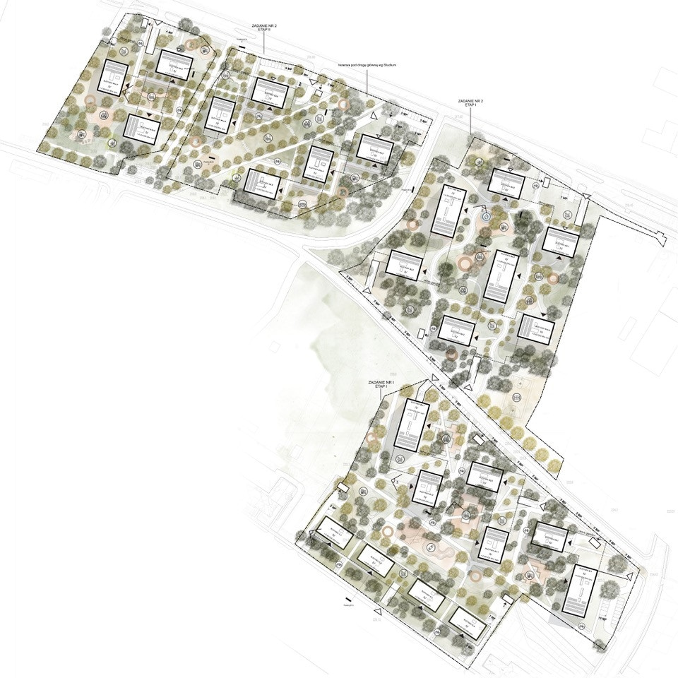 Były to trzy projekty mieszkaniowe w Gliwicach, z których dwa zdobyły nagrody. Pierwszy, nagrodzony II miejscem, to osiedle przy ul. Pszczyńskiej i Kujawskiej. Punktem wyjścia był krajobraz i istniejąca zieleń, którą staraliśmy się zachować. Zabudowę ukształtowaliśmy tak, by powstały różnorodne przestrzenie - od uporządkowanych ogrodów, przez swobodne ścieżki i pagórki, po bardziej dynamiczne formy. Ceglane elewacje z ceramicznymi detalami i muralami tworzą spójny, przyjazny klimat.