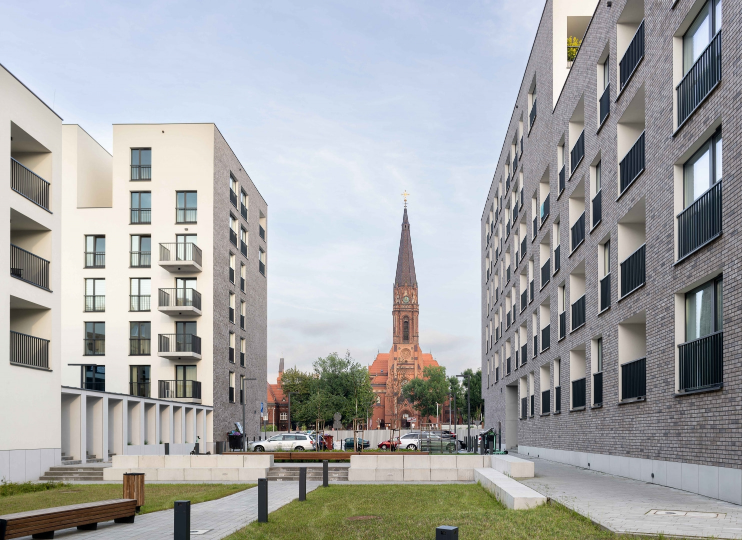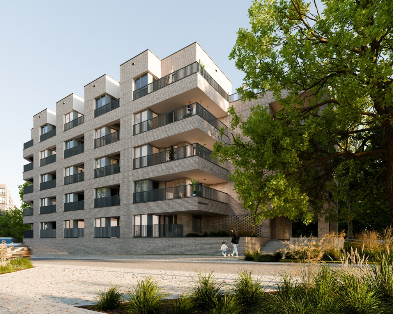 Do osiedla Nova Mikołowska nawiązuje natomiast rozrzeźbiona bryła, a także rytm cofniętych loggii i tarasów oraz elewacja wykończona jasną cegłą. Te elementy budują ciągłość obu realizacji, a jednocześnie pozwalają nowemu budynkowi zachować własną, bardziej kameralną tożsamość. Kolor szarej cegły przyjęty jako podstawowy w melanżu elewacji prowadzi subtelny dialog z historyczną zabudową Katowic i podkreśla współczesny charakter projektu.