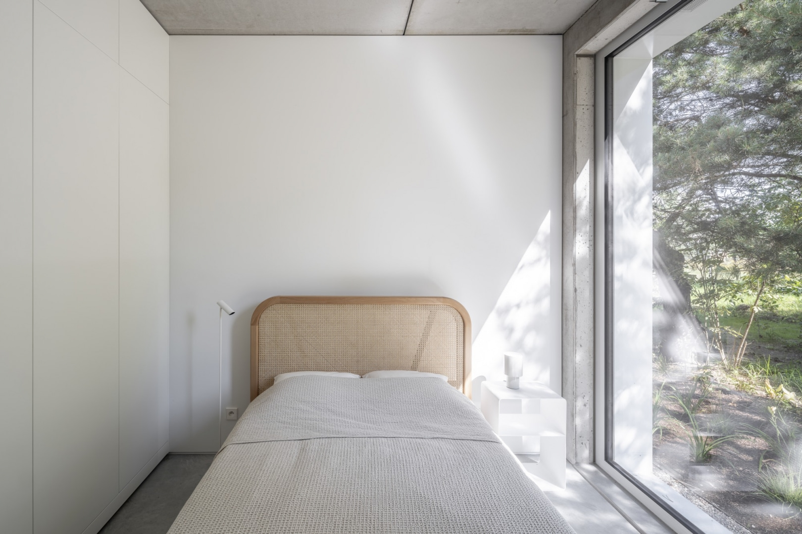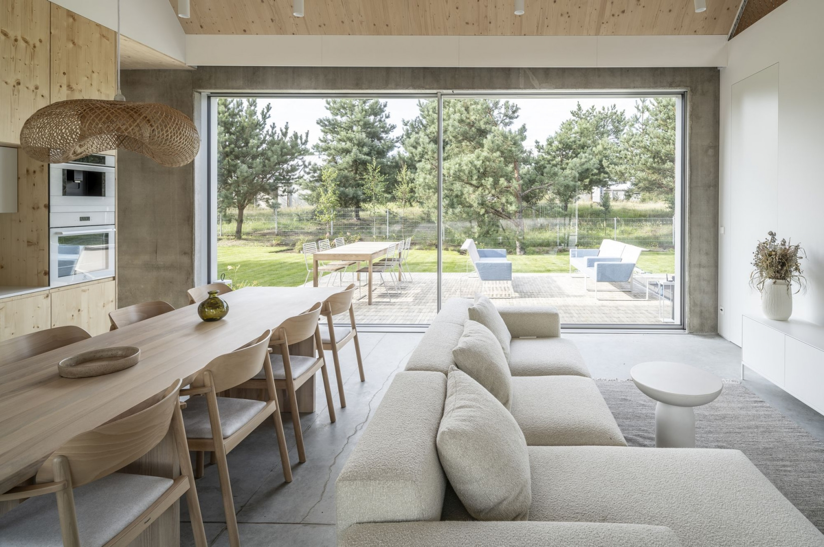 W projekcie dominuje prostota i minimalizm środków, stonowane barwy oraz naturalne, szlachetne materiały najwyższej klasy. We wnętrzach to głównie jesionowe i świerkowe drewno, użyte m.in. na podbitce dachu, schodach, podłodze na antresoli i we frontach kuchennych, a także beton architektoniczny, z którego wykonana jest m.in. podłoga na parterze. Uwagę zwracają wielkoformatowe przeszklenia o cienkich ramach, w tym wyjątkowo lekkie i eleganckie przesuwne okna otwierające dom na dwie strony: taras z ogrodem oraz część frontową.