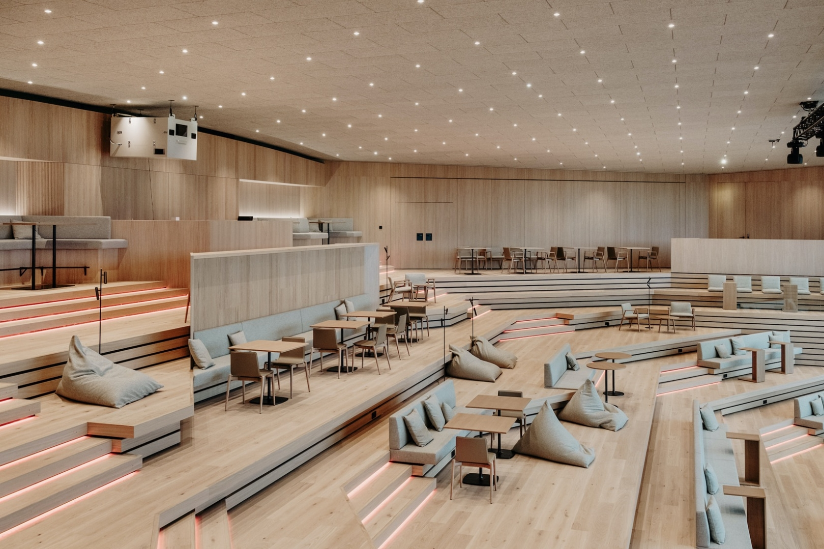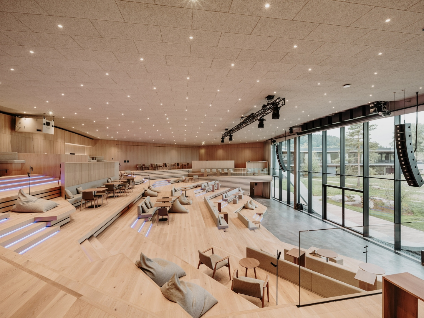 Kolorystka sufitów jest dokładnie dopasowana do ścian, podłóg, mebli. Naturalny odcień drewna łączy się z naturą „wchodzącą” do auli z zielonych terenów wokół kampusu. Nawet oświetlenie nawiązuje do przyrody. Umiejscowione w panelach sufitowych punkty oświetleniowe w czasie przyciemnionego, konferencyjnego światła sprawiają wrażenie jakby siedziało się pod rozgwieżdżonym niebem.