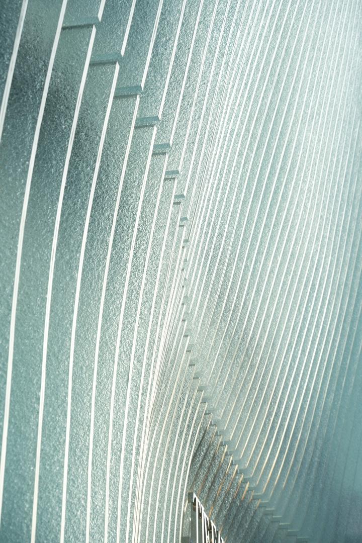 „Patrząc z boku, warstwowy efekt gęstych szklanych żeber wzmacnia światło, podkreślając kształt fasady” – mówi Jacob van Rijs, współzałożyciel MVRDV. – „Światło filtrujące i odbijające się od półprzezroczystego szkła tworzy delikatną grę, nieustannie zmieniając fasadę z każdym ruchem".