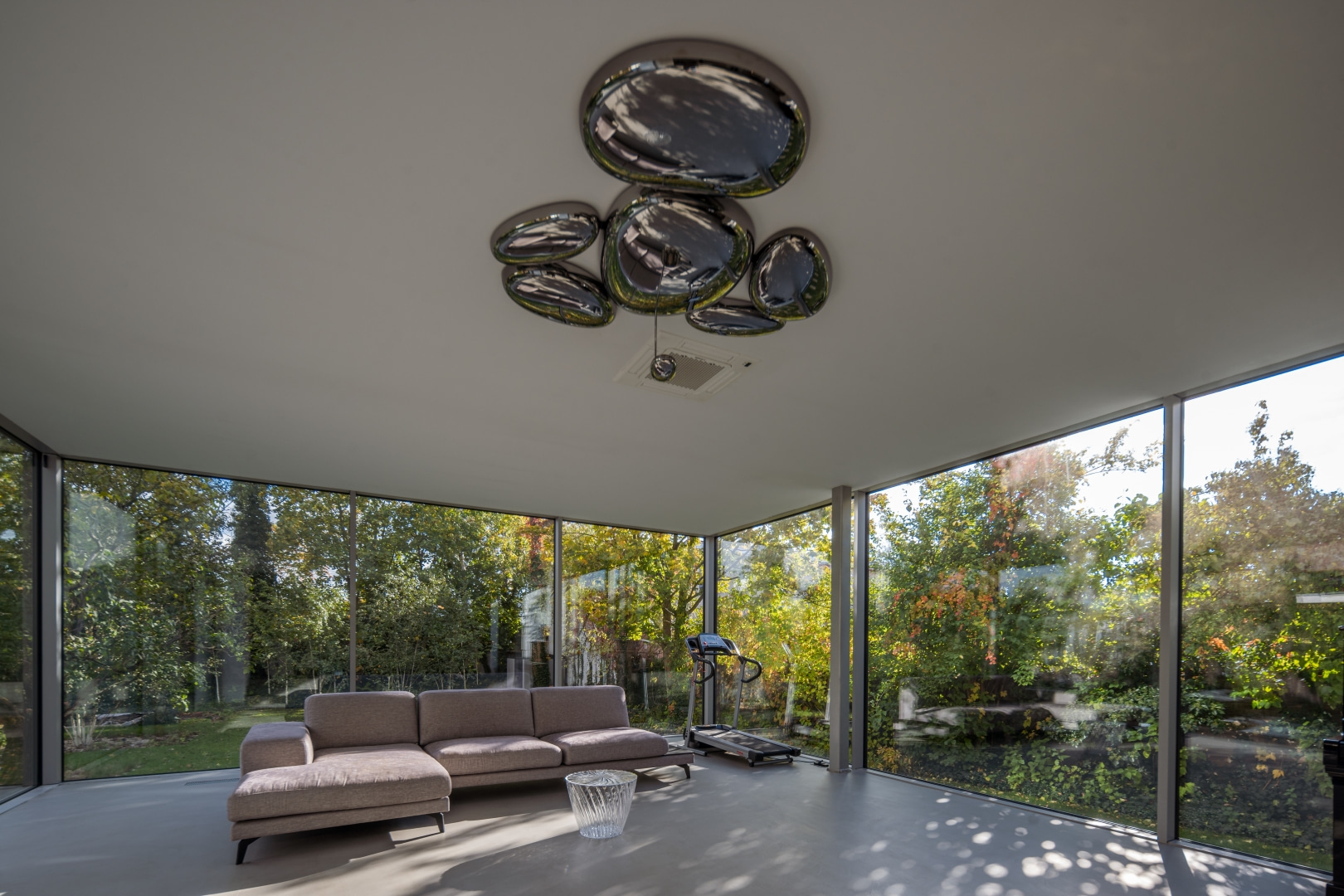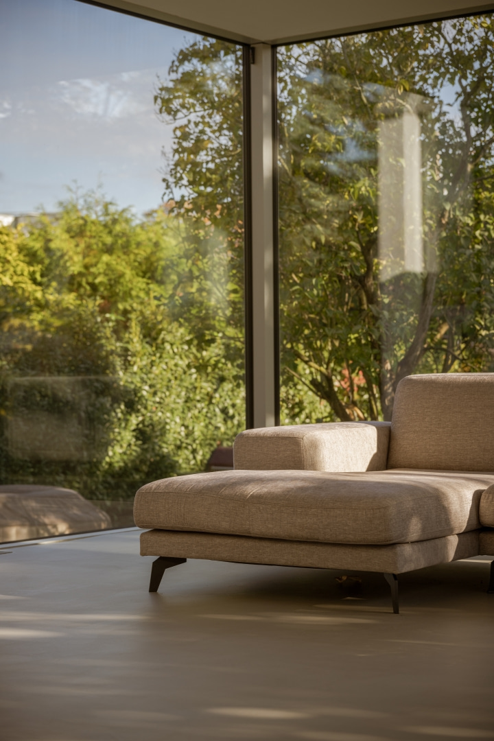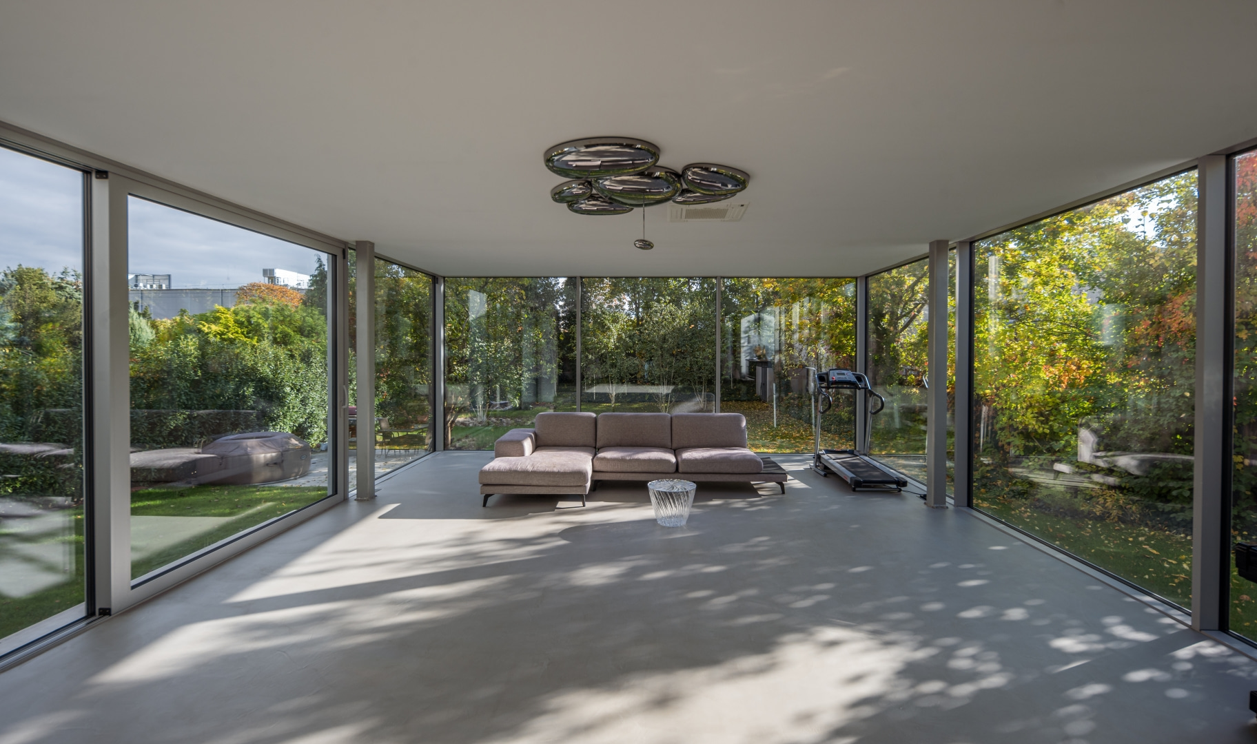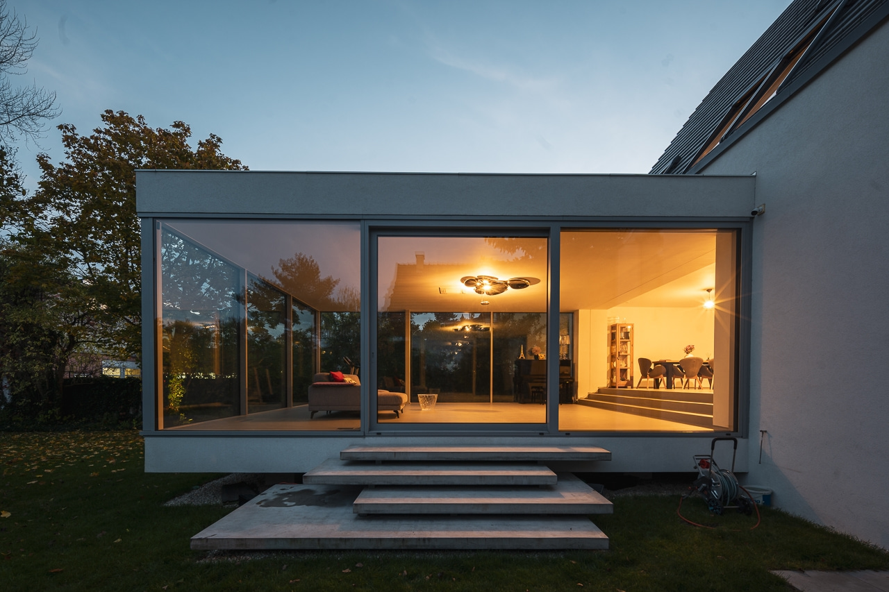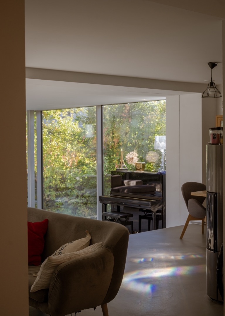 Najbardziej wyrazistą interwencją jest rozbudowa strefy dziennej. Odpowiadając na problem niewielkich, słabo doświetlonych pomieszczeń, salon powiększono o nową, przeszkloną przestrzeń wypoczynkową. Współczesna forma tej części, wysunięta poza obrys istniejącego budynku, otwiera wnętrze na ogród poprzez pełnowysokie przeszklenia. Dzięki temu granica między wnętrzem a otoczeniem ulega zatarciu, a użytkownicy zyskują bezpośredni kontakt z naturą i zmiennością krajobrazu.