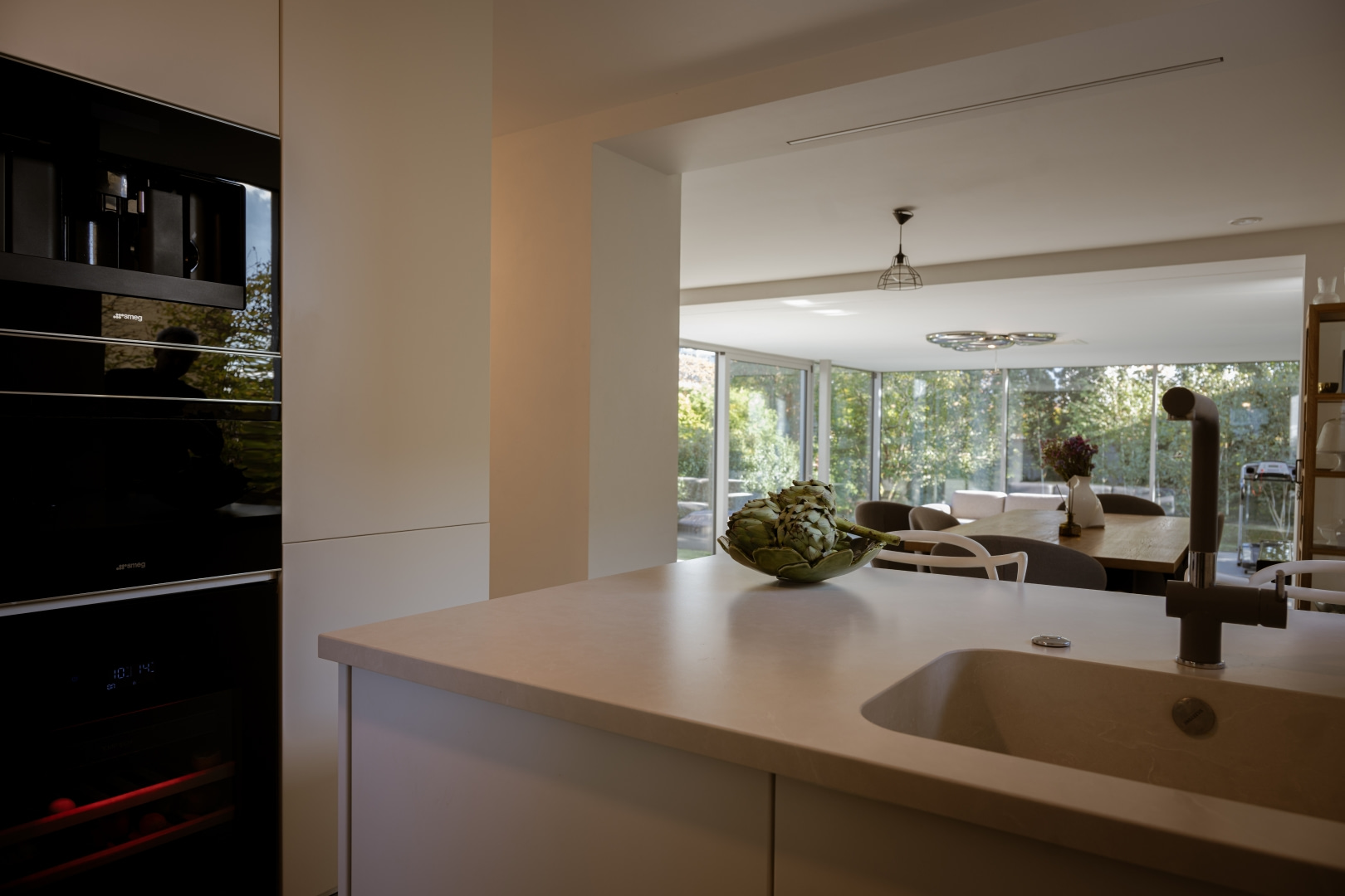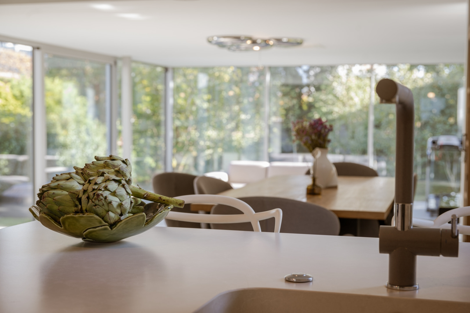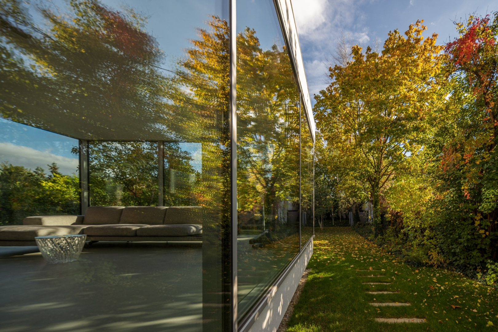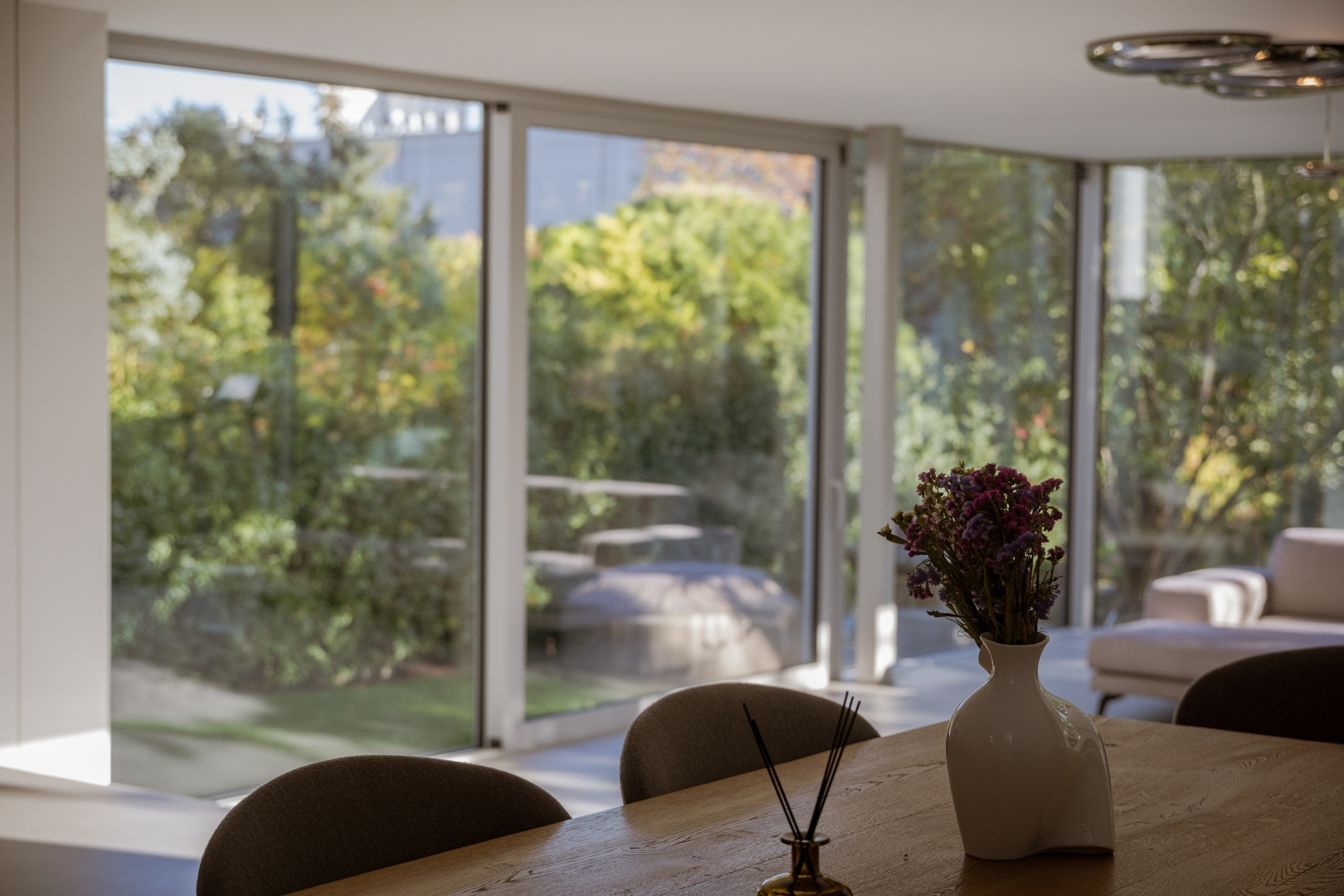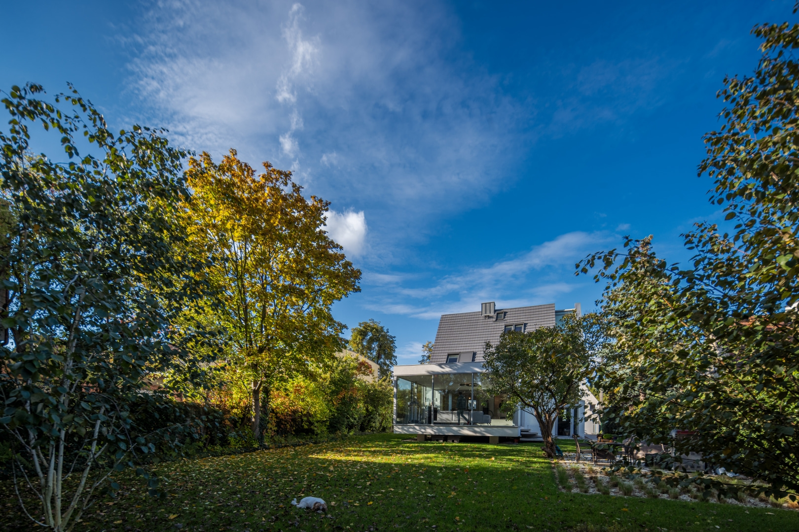 Najbardziej wyrazistą interwencją jest rozbudowa strefy dziennej. Odpowiadając na problem niewielkich, słabo doświetlonych pomieszczeń, salon powiększono o nową, przeszkloną przestrzeń wypoczynkową. Współczesna forma tej części, wysunięta poza obrys istniejącego budynku, otwiera wnętrze na ogród poprzez pełnowysokie przeszklenia. Dzięki temu granica między wnętrzem a otoczeniem ulega zatarciu, a użytkownicy zyskują bezpośredni kontakt z naturą i zmiennością krajobrazu.