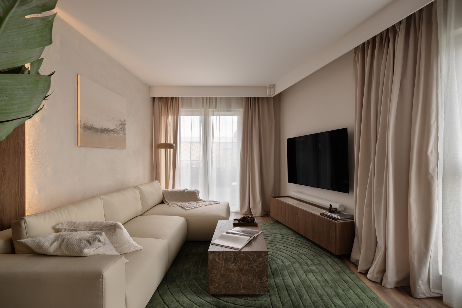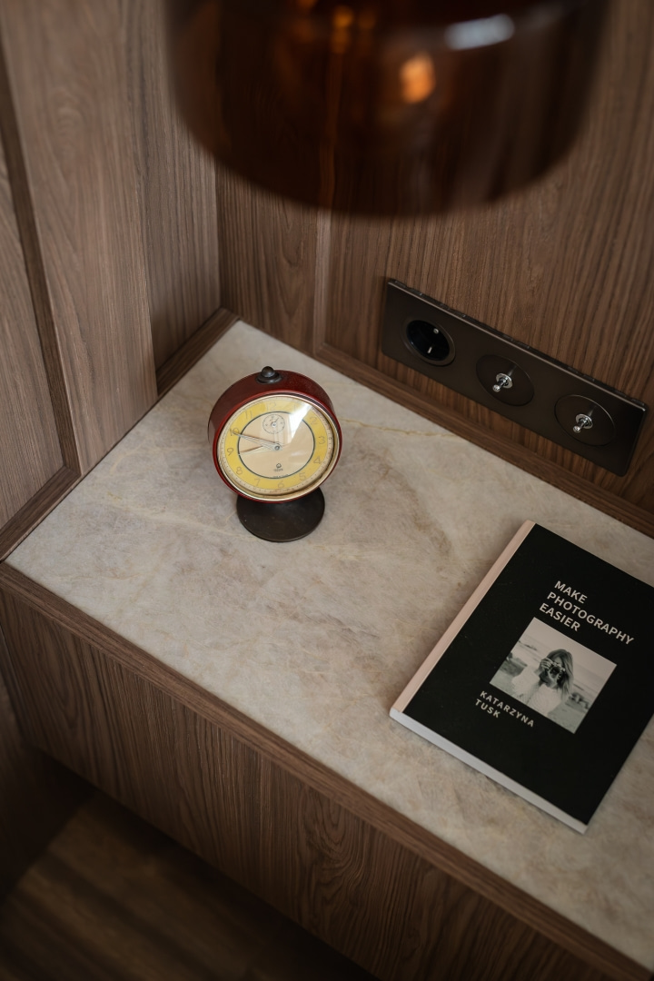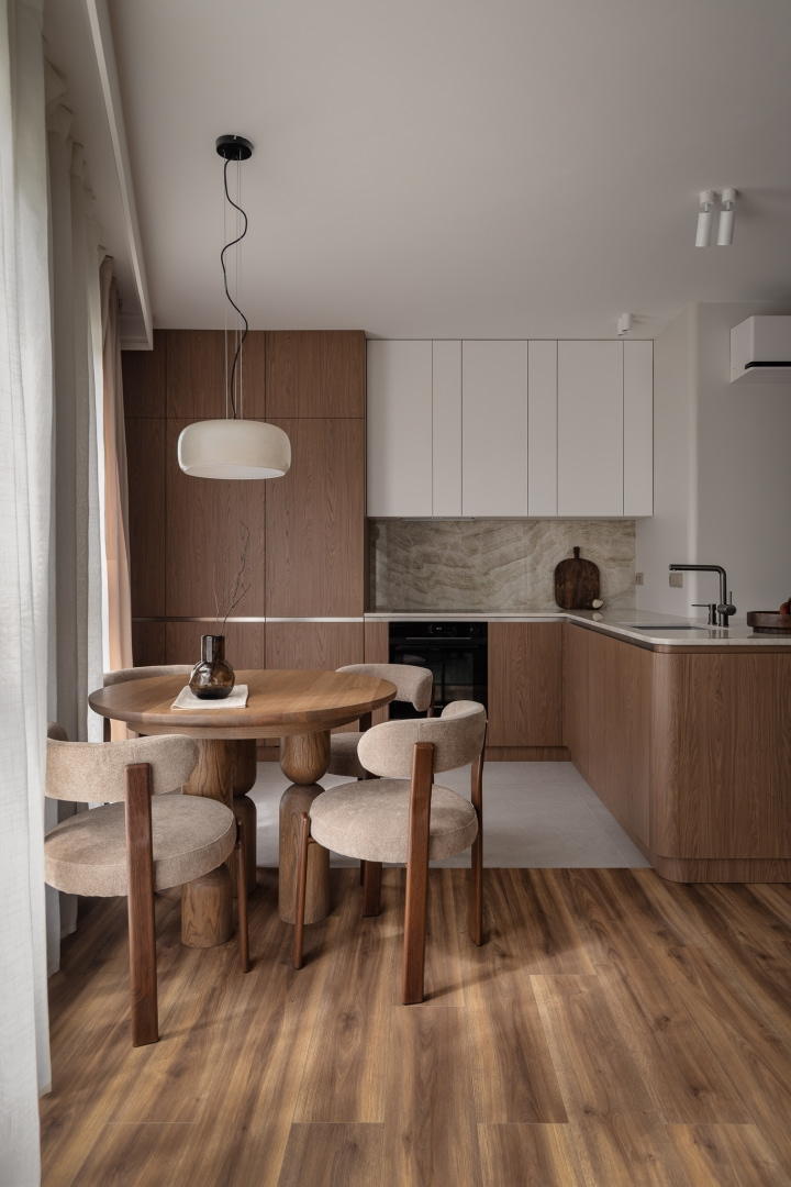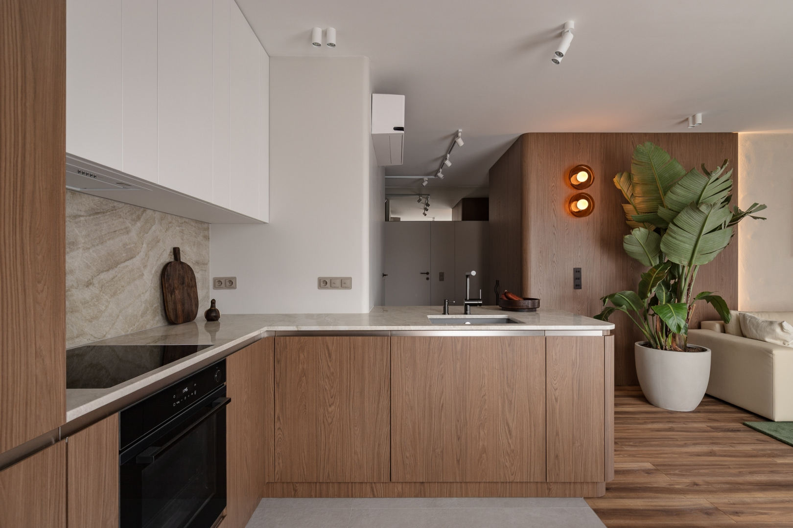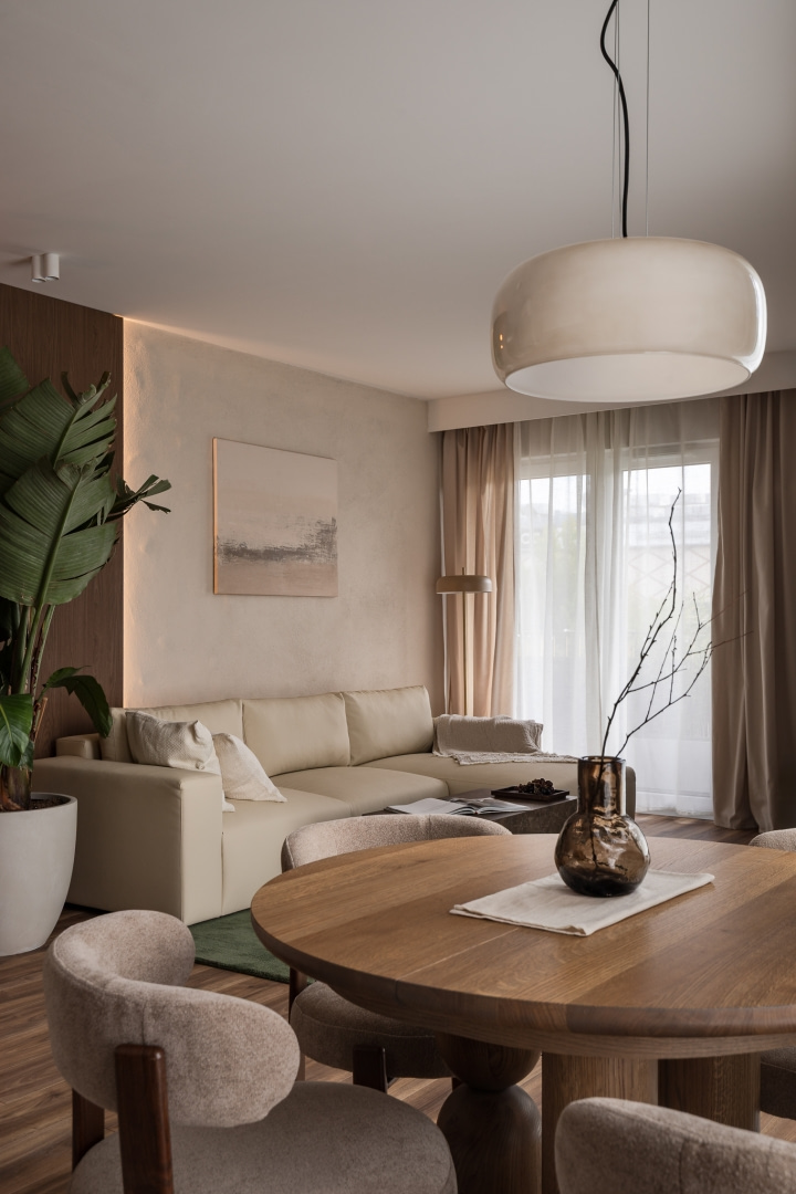 Kluczowym celem było przywrócenie wnętrzu spójności. Osiągnięto to przez uporządkowanie materiałów, korektę proporcji zabudów oraz dopracowanie relacji między strefą dzienną i prywatną. W projekcie zastosowano ciepłą, wyciszoną paletę: drewno, jasne płaszczyzny, kamienne akcenty i miękkie tkaniny. Zamiast budować efekt na kontrastach, postawiono na konsekwencję i płynność, dzięki czemu mieszkanie odzyskało rytm i czytelność.