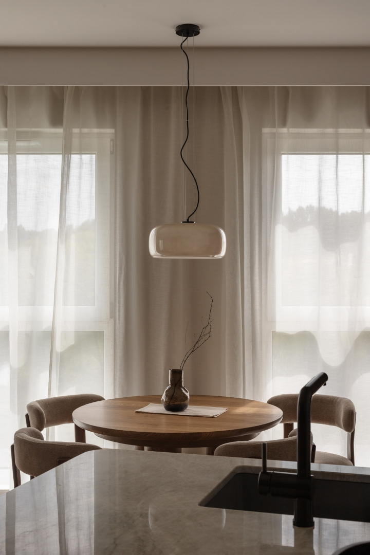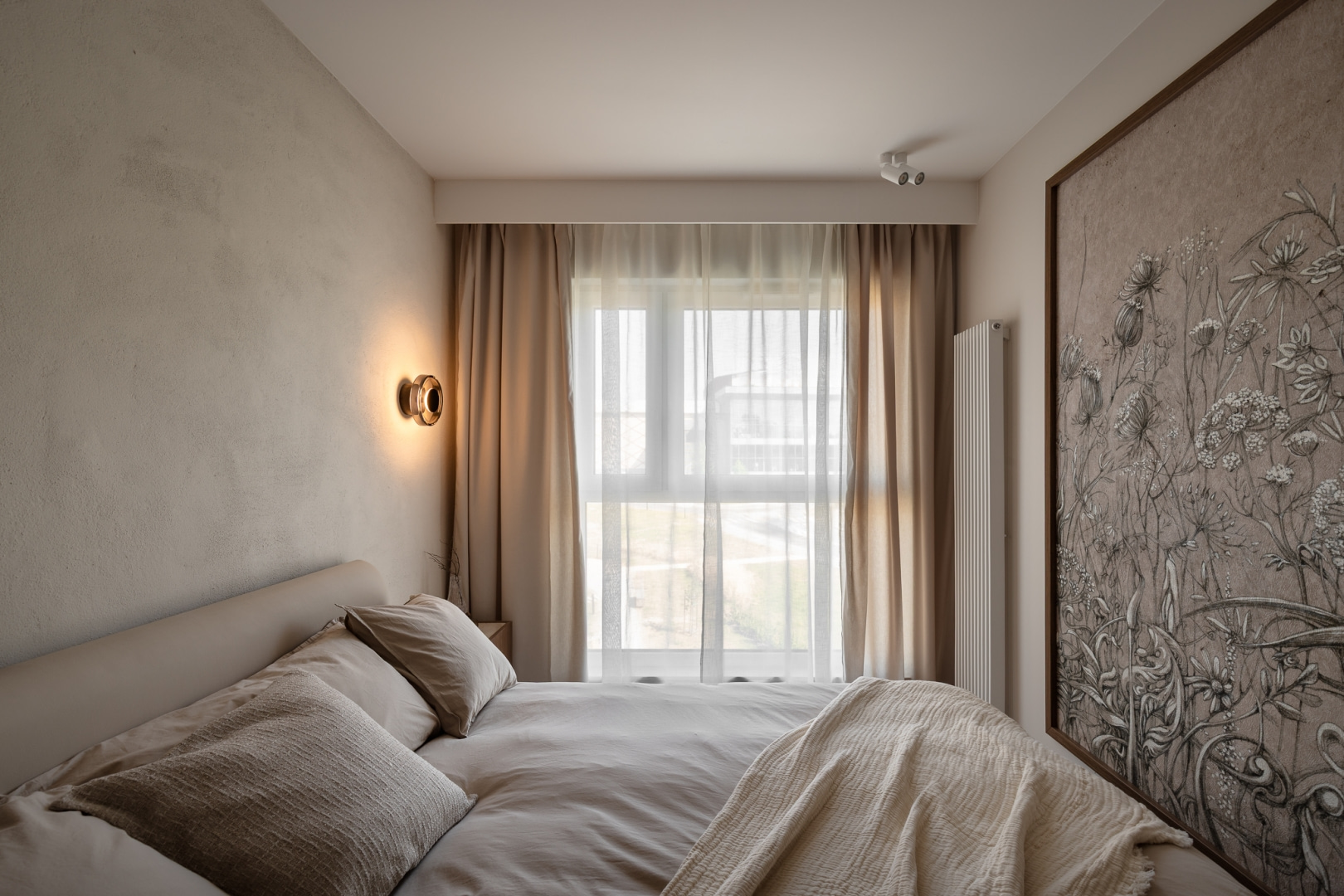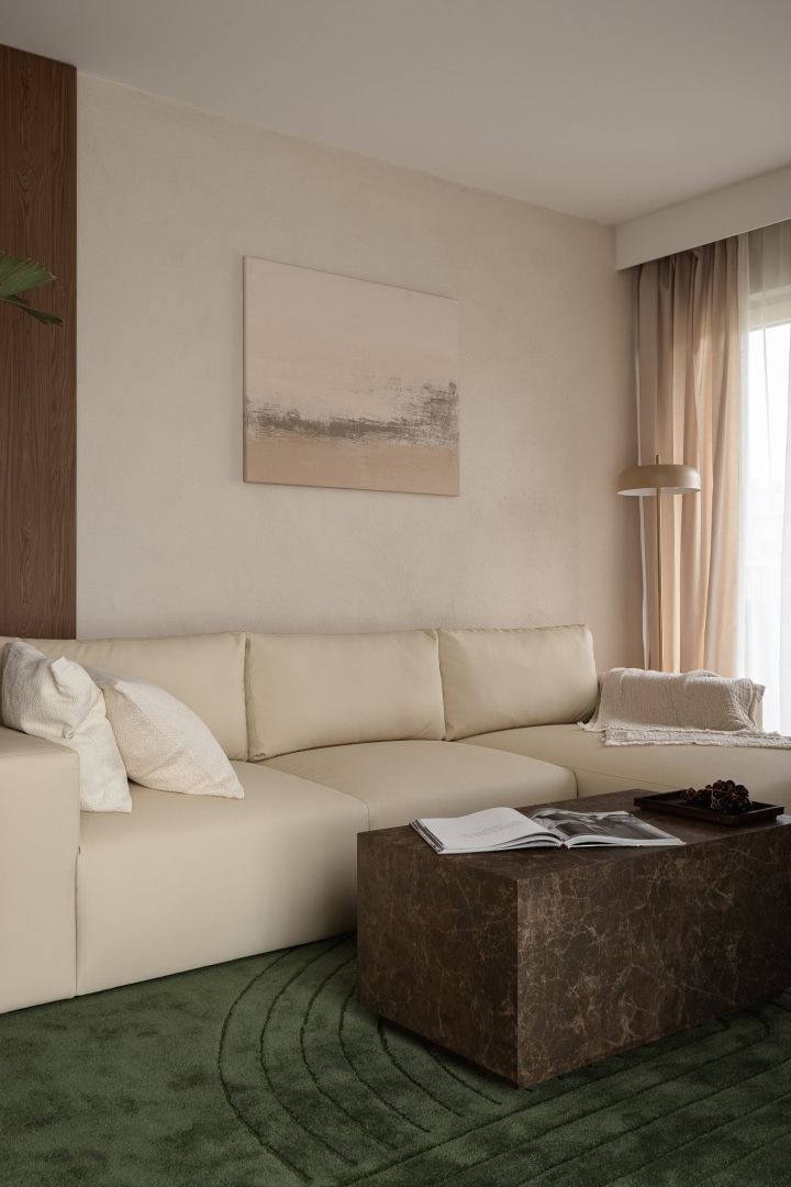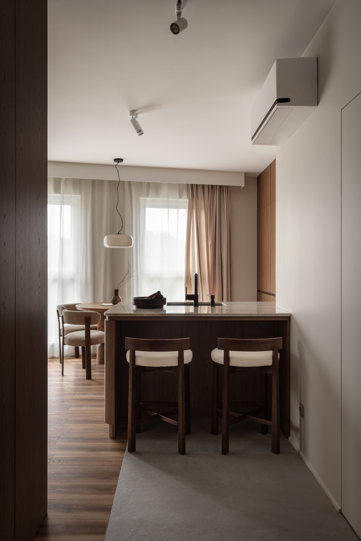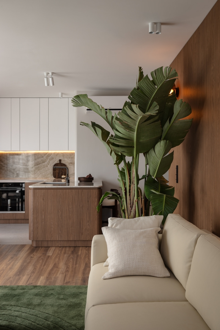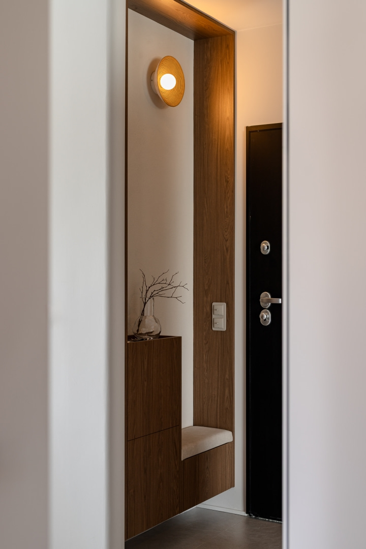 Kluczowym celem było przywrócenie wnętrzu spójności. Osiągnięto to przez uporządkowanie materiałów, korektę proporcji zabudów oraz dopracowanie relacji między strefą dzienną i prywatną. W projekcie zastosowano ciepłą, wyciszoną paletę: drewno, jasne płaszczyzny, kamienne akcenty i miękkie tkaniny. Zamiast budować efekt na kontrastach, postawiono na konsekwencję i płynność, dzięki czemu mieszkanie odzyskało rytm i czytelność.