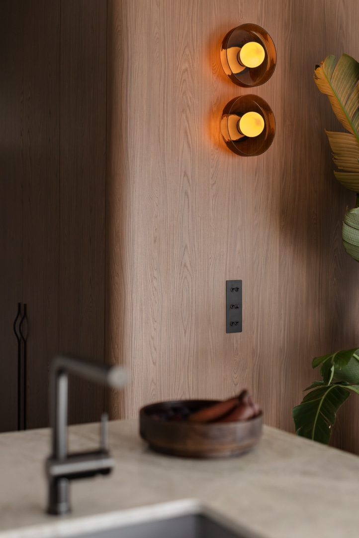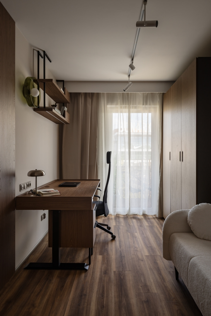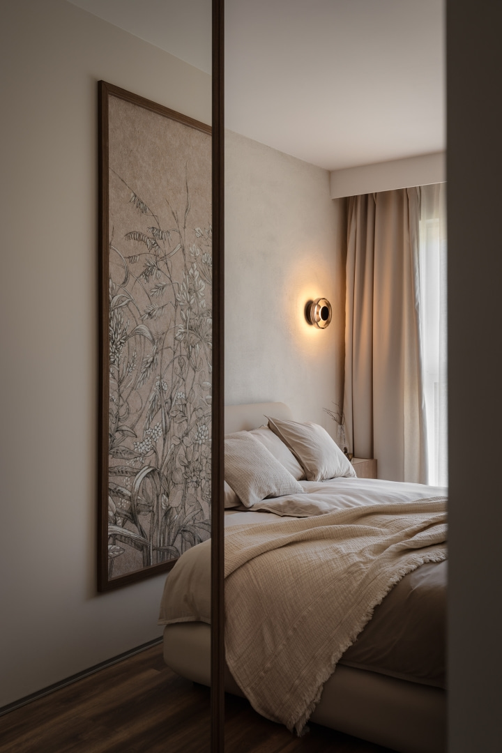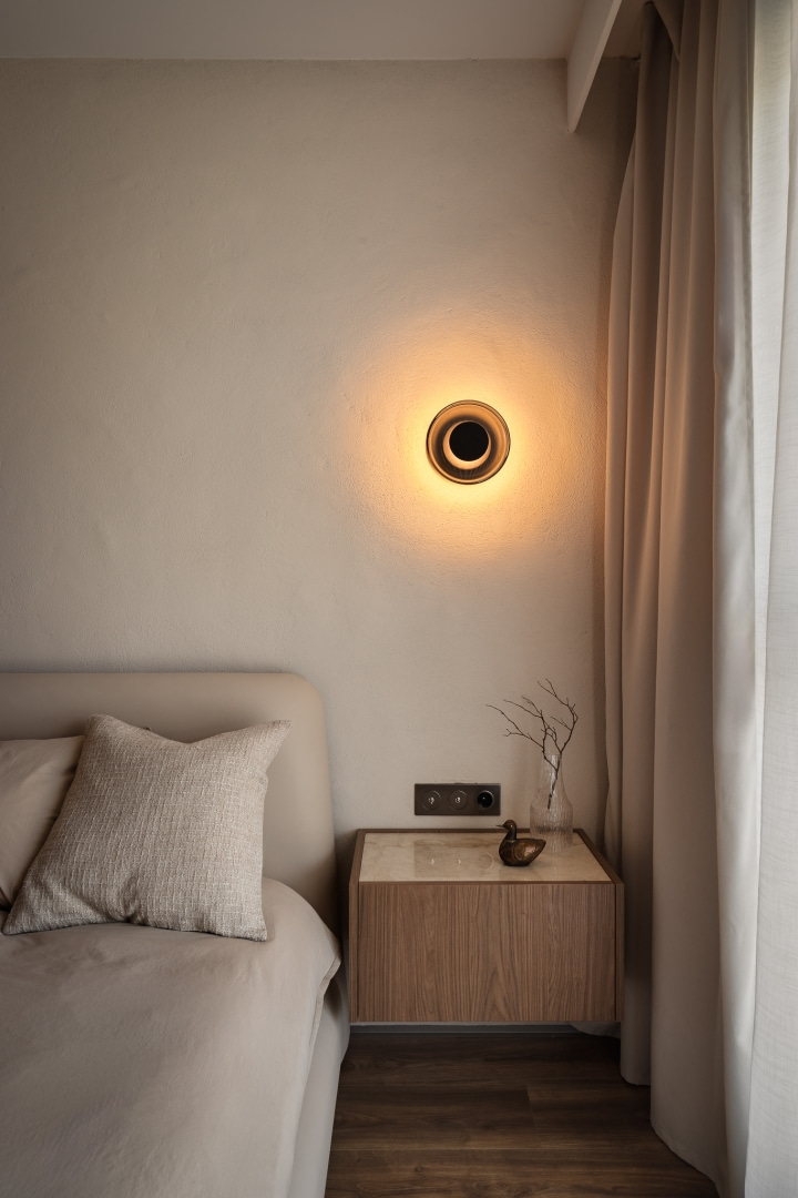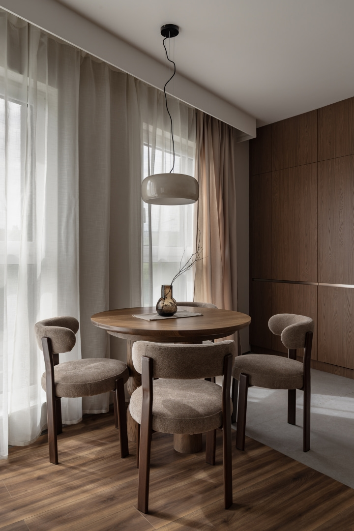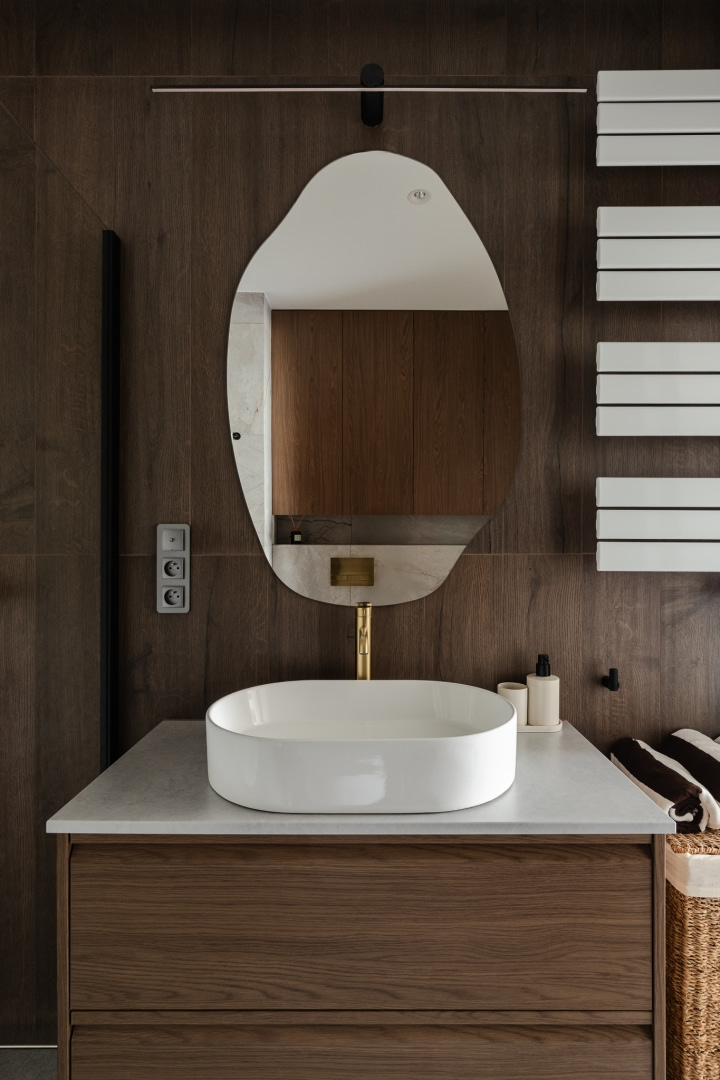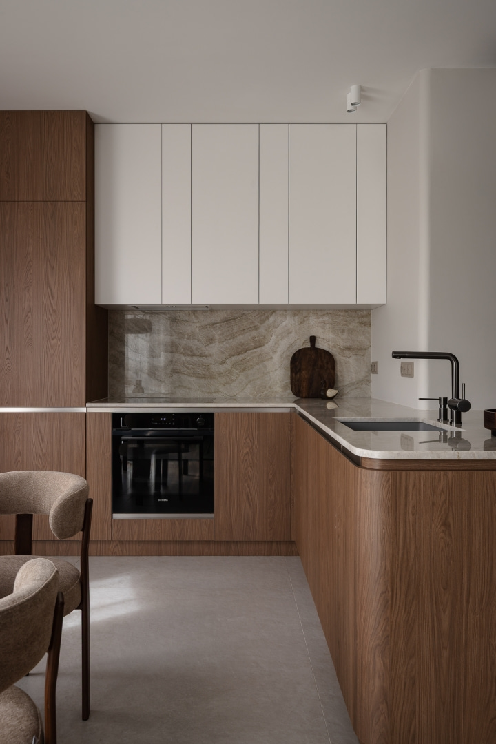 Kluczowym celem było przywrócenie wnętrzu spójności. Osiągnięto to przez uporządkowanie materiałów, korektę proporcji zabudów oraz dopracowanie relacji między strefą dzienną i prywatną. W projekcie zastosowano ciepłą, wyciszoną paletę: drewno, jasne płaszczyzny, kamienne akcenty i miękkie tkaniny. Zamiast budować efekt na kontrastach, postawiono na konsekwencję i płynność, dzięki czemu mieszkanie odzyskało rytm i czytelność.