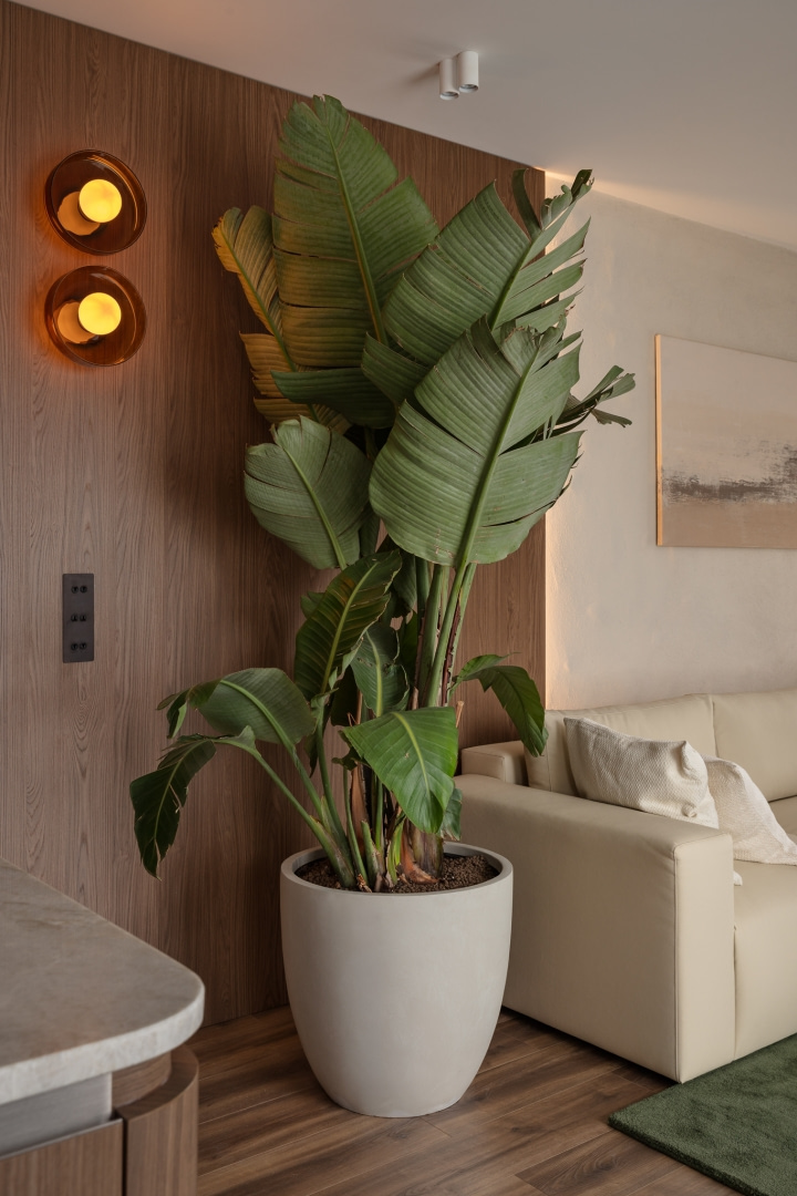 Ważnym elementem aranżacji stały się duże rośliny, wprowadzone jako świadome akcenty przestrzenne. Pełnią rolę większą niż dekoracja - porządkują perspektywy, domykają kadry i wprowadzają naturalny kontrapunkt dla uporządkowanej geometrii wnętrza. Dzięki temu przestrzeń zyskała miękkość i charakter, nie tracąc przy tym swojego spokojnego, funkcjonalnego wyrazu.