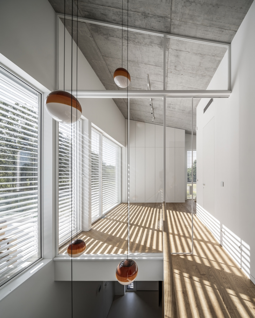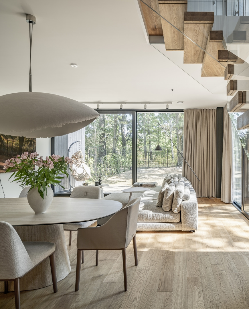 Duże przeszklenia otwierają wnętrza domów na otaczającą zieleń, zapewniając doskonałe doświetlenie oraz naturalny, niezaburzony kontakt z krajobrazem – jednym z największych atutów Konstancina. Jednocześnie układ zabudowy został zaprojektowany z myślą o maksymalnej prywatności mieszkańców. Wysunięte mury oraz odpowiednie kształtowanie brył sprawiają, że z przestrzeni dziennych nie ma bezpośrednich widoków na okna i ogrody sąsiednich domów.