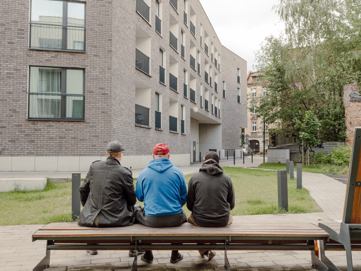 Osiedle, mimo że nowe, nie zostało odgrodzone od miasta. Przestrzenie pomiędzy budynkami pozostają ogólnodostępne – korzystają z nich nie tylko mieszkańcy, lecz także przechodnie i sąsiedzi z pobliskich kamienic. Fotografie Joanny Targosz udowadniają, że dziedzińce i przejścia stały się częścią codziennych tras pieszych: jedni skracają sobie drogę, inni odpoczywają na ławkach, spędzają czas z dziećmi czy wyprowadzają psy.