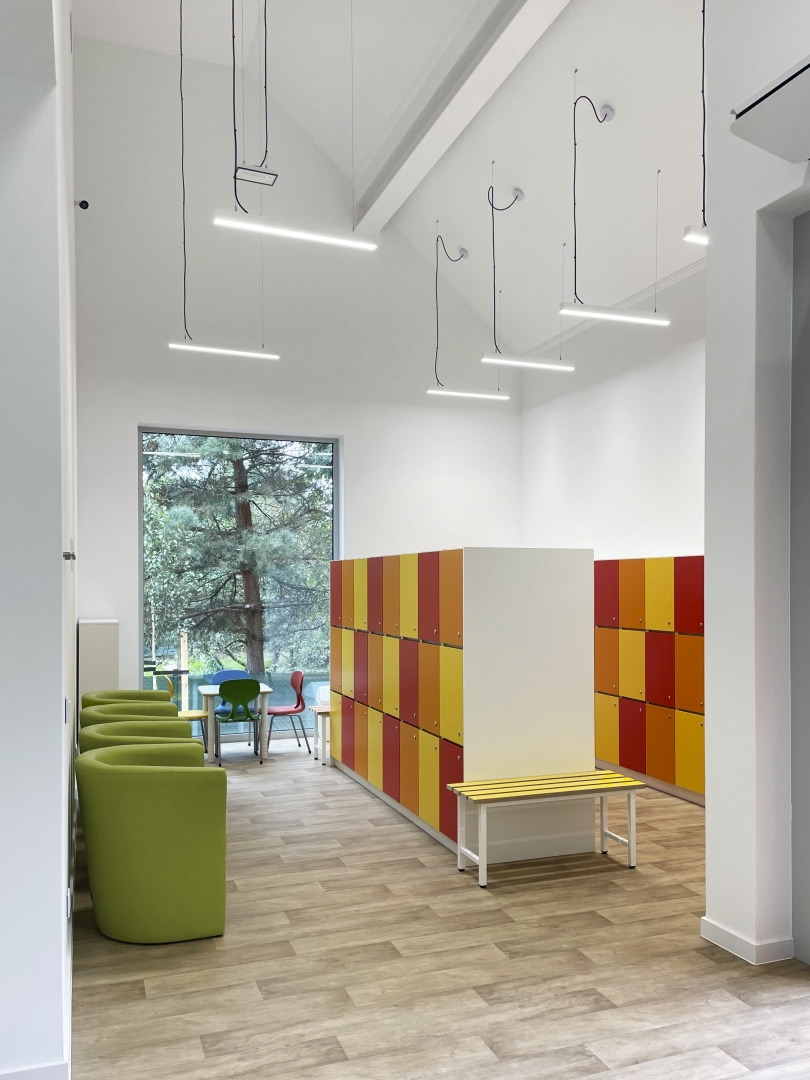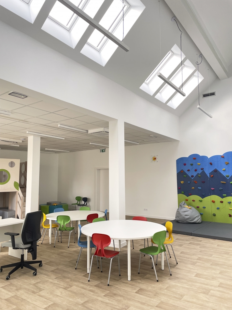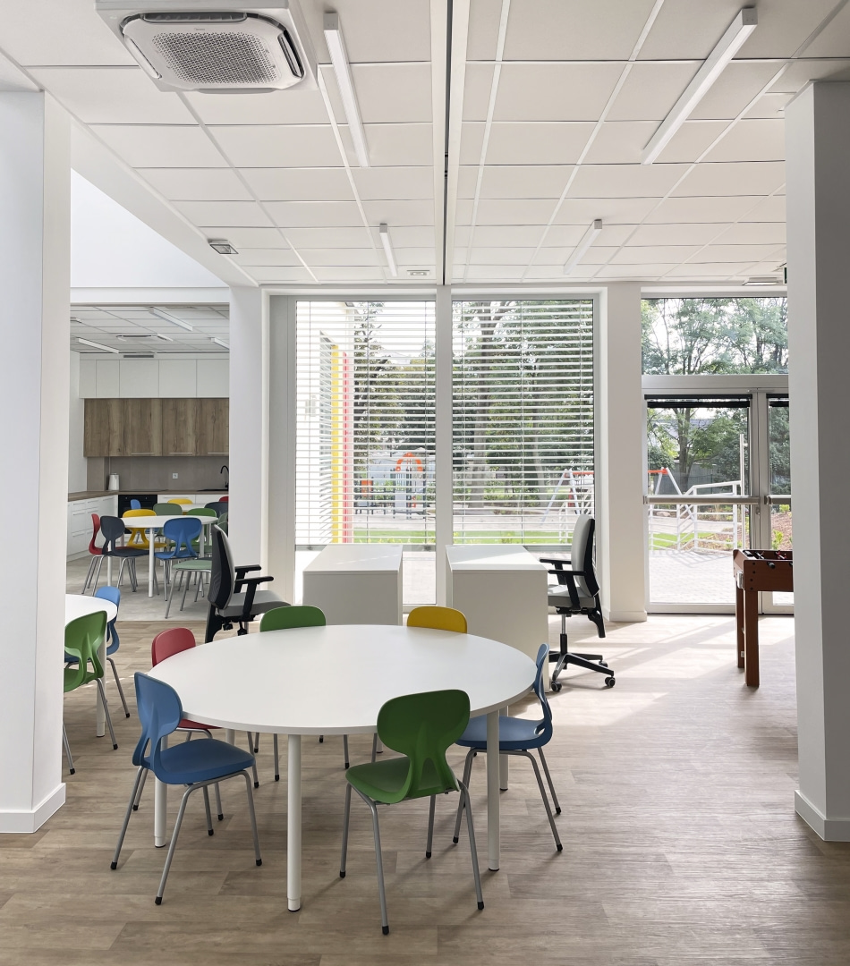 Obie części spina przeszklony łącznik, w którym znajduje się główna sala świetlicowa – serce budynku i miejsce codziennych spotkań, zajęć oraz wspólnej zabawy.