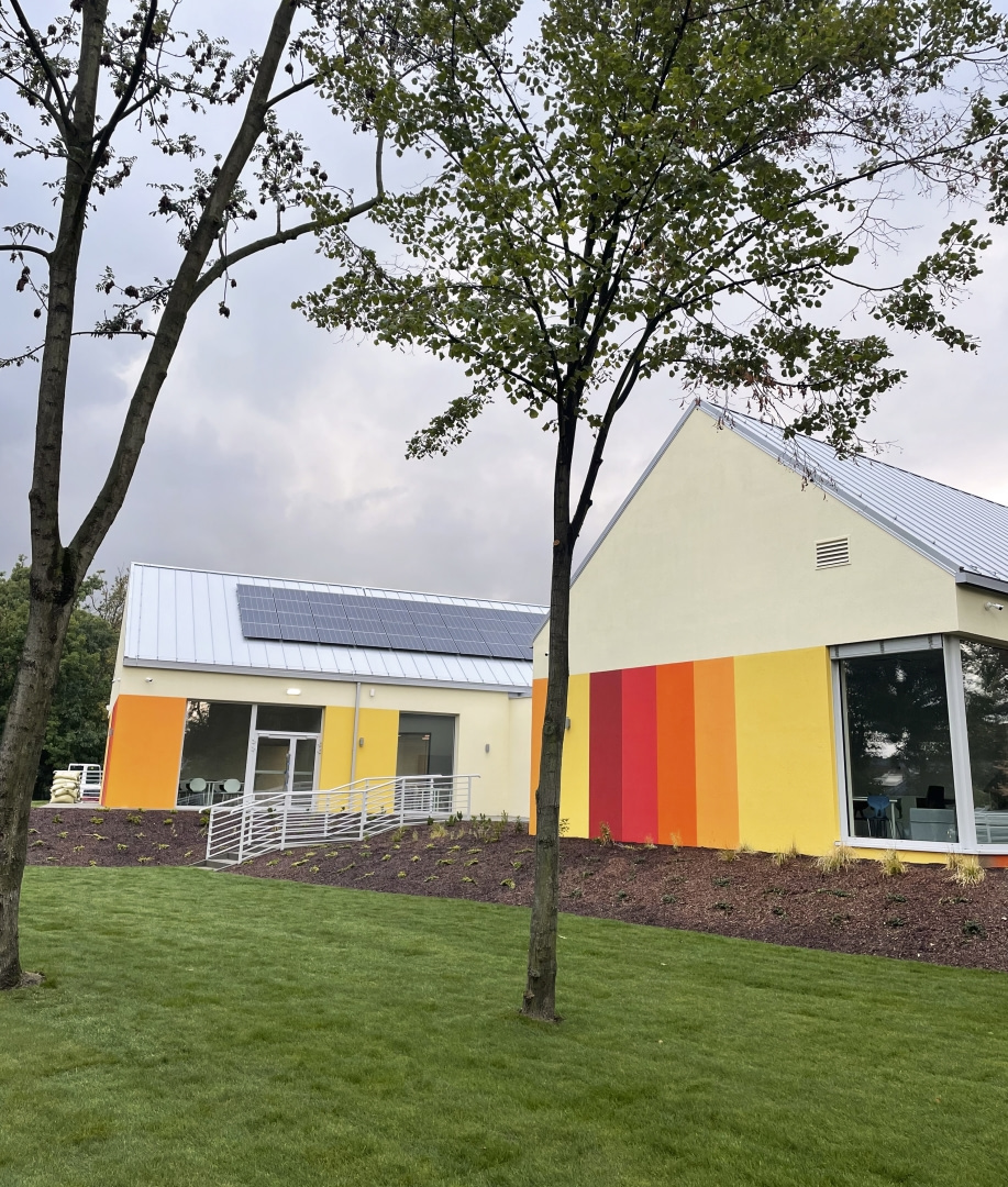 Elewacja budynku została zaprojektowana z myślą o najmłodszych – jest radosna i przyjazna, utrzymana w kolorystyce logotypu Fundacji Polsat. Barwne akcenty tworzą pogodny nastrój i budują poczucie bezpieczeństwa, jednocześnie nadając budynkowi indywidualny, rozpoznawalny charakter.