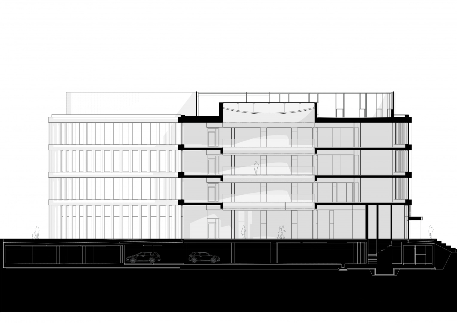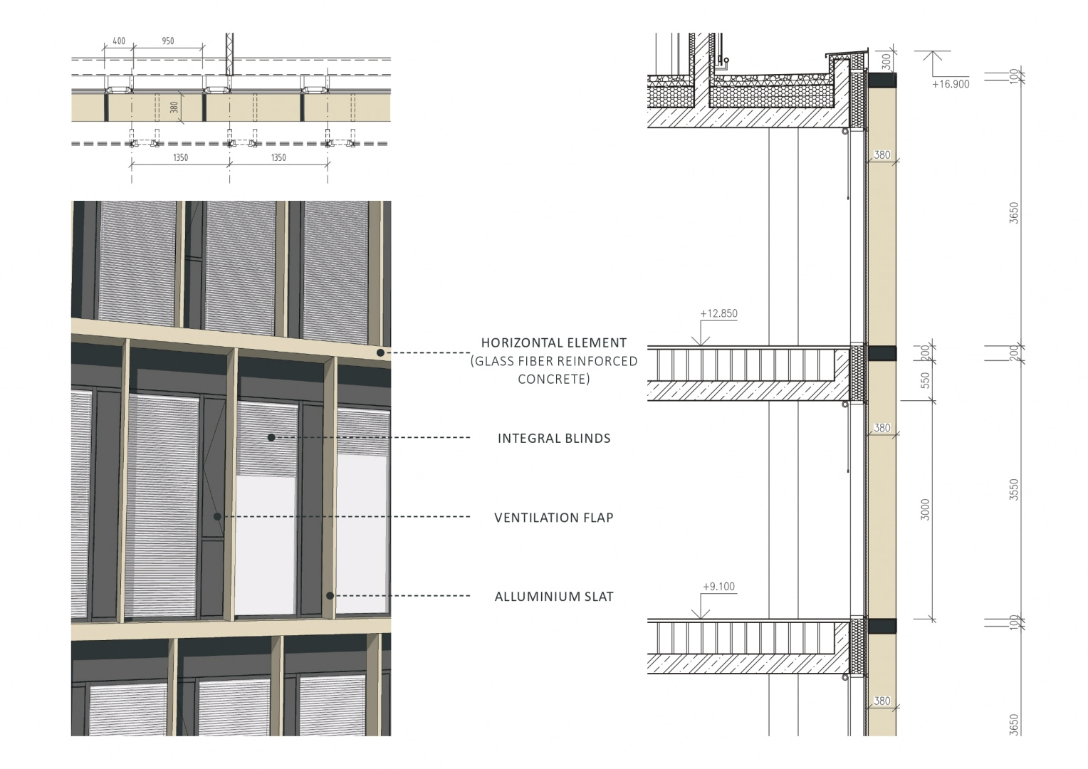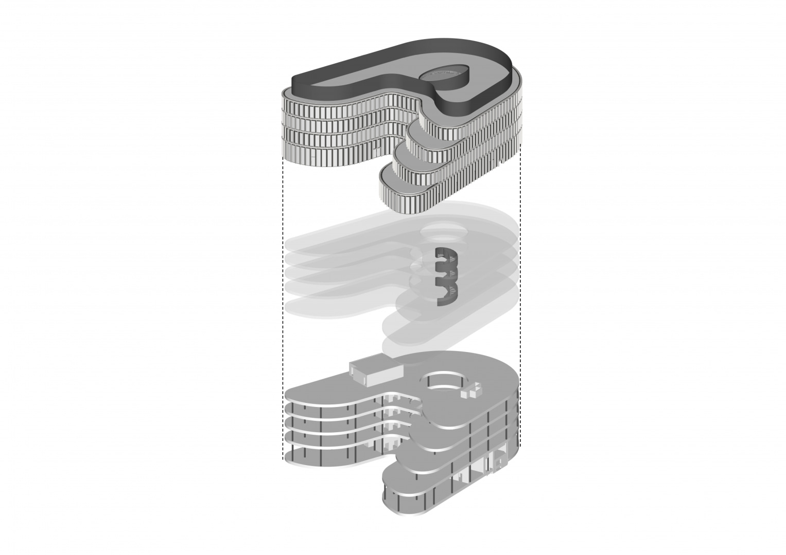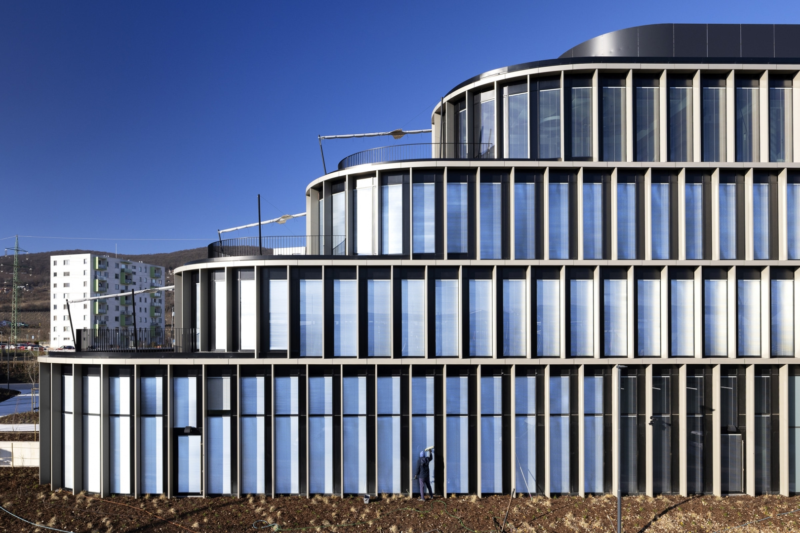 Elewacja kontynuuje biometryczną metaforę poprzez subtelny rytm pionowych elementów i miękkich, zaokrąglonych linii. Kształt skrzydeł budynku przywodzi na myśl warstwowe grzbiety linii papilarnych, które stopniowo zbiegają się i otwierają w kierunku głównego wejścia. Połączenie pionowo połączonych przeszkleń i ciepłych, złotych, metalowych ram nadaje budynkowi elegancki i technicznie precyzyjny wygląd, a zaokrąglone kształty i delikatne zacienienie zapewniają zrównoważoną, ludzką skalę.
