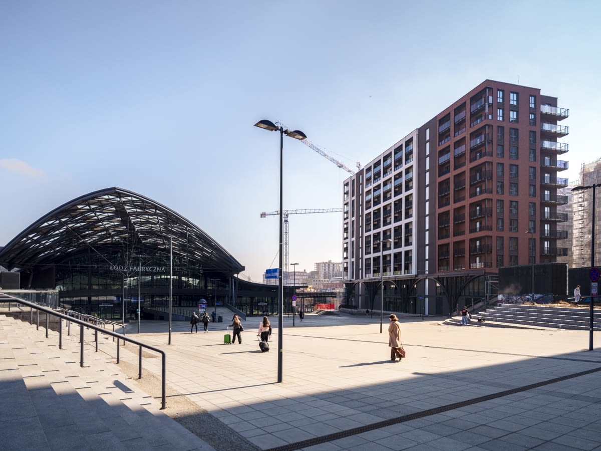 Gotowy budynek zlokalizowany jest najbliżej Dworca Łódź Fabryczna. Do użytkowania oddanych zostało tu 186 mieszkań oraz 6 lokali usługowych o łącznej powierzchni ponad 7 000 mkw. Architektura budynku ze względu na jego lokalizację czerpie z estetyki infrastruktury kolejowej. Charakterystycznym elementem obiektu są stalowe arkady oraz elewacje wykończone m.in. klinkierem i tynkiem o zróżnicowanej fakturze. Wszystkie te elementy podkreślają lokalny kontekst urbanistyczny projektu.