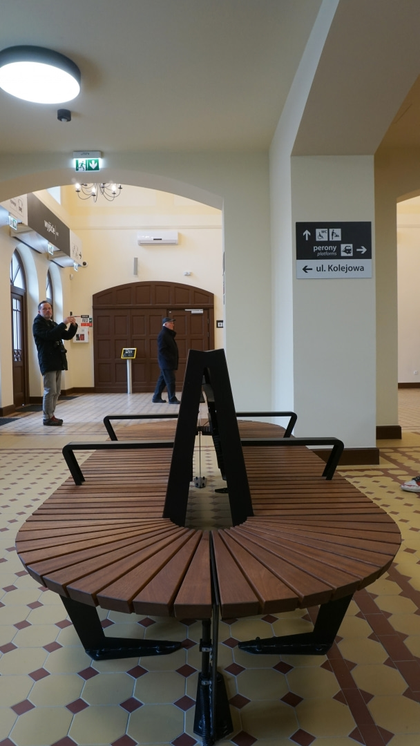 Miejsce obsługi podróżnych zlokalizowano w holu budynku, pełniącym jednocześnie funkcję poczekalni, o powierzchni powyżej 150 m kw. To wygodna, klimatyzowana i ogrzewana przestrzeń łącząca historyczny charakter z nowoczesnym wyposażeniem. We wnętrzu odnowiono zabytkową posadzkę i strop. Znalazły się tam również elektroniczne tablice przyjazdów i odjazdów pociągów, gabloty z rozkładami jazdy oraz ławki z możliwością ładowania urządzeń mobilnych. Z kolei w pobliżu holu zlokalizowano pomieszczenia pod kasy biletowe (czynna jest już kasa Kolei Śląskich), toalety oraz niewielki lokal przeznaczony pod najem komercyjny. W przebudowanym budynku o powierzchni użytkowej ponad 4 tys. m kw. mieścić się będą także: posterunek Straży Ochrony Kolei oraz serwerownie operatorów telekomunikacyjnych. Jednakże znaczną część przestrzeni w obiekcie zajmie samorząd lokalny – powstaną tu Centrum Usług Społecznych oraz muzeum miejskie, którego główną salą wystawienniczą będzie historyczna sala restauracji z interesującym stropem kasetonowo-kolebkowym.