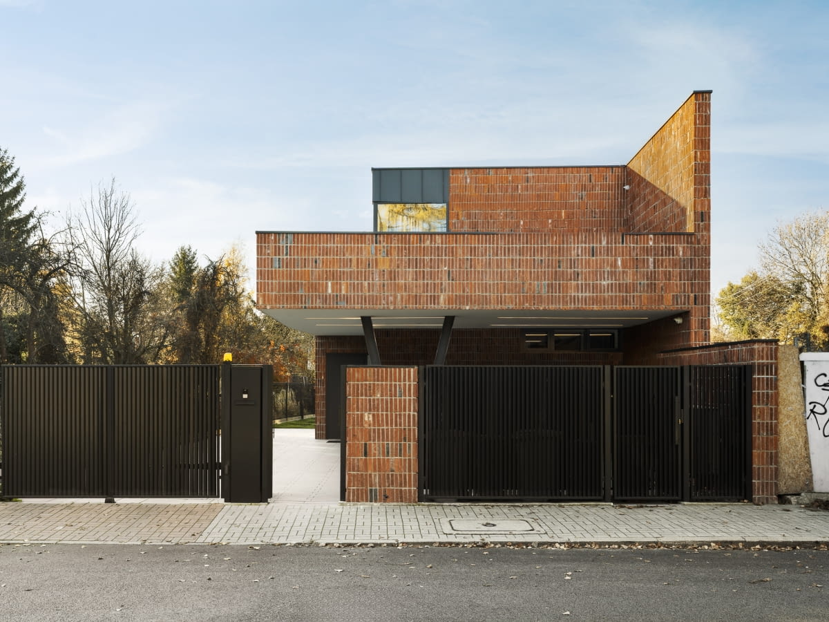 Dom został zaprojektowany dla współczesnej rodziny 2+3. Elewacja została wykończona płytką ciętą z pełnej ręcznie formowanej cegły. Płytka została ułożona w regularny sposób w poziomych pasach. Sposób ułożenia płytki porządkuje elewację a jej struktura nadaje jej wyrazisty szorstki charakter.