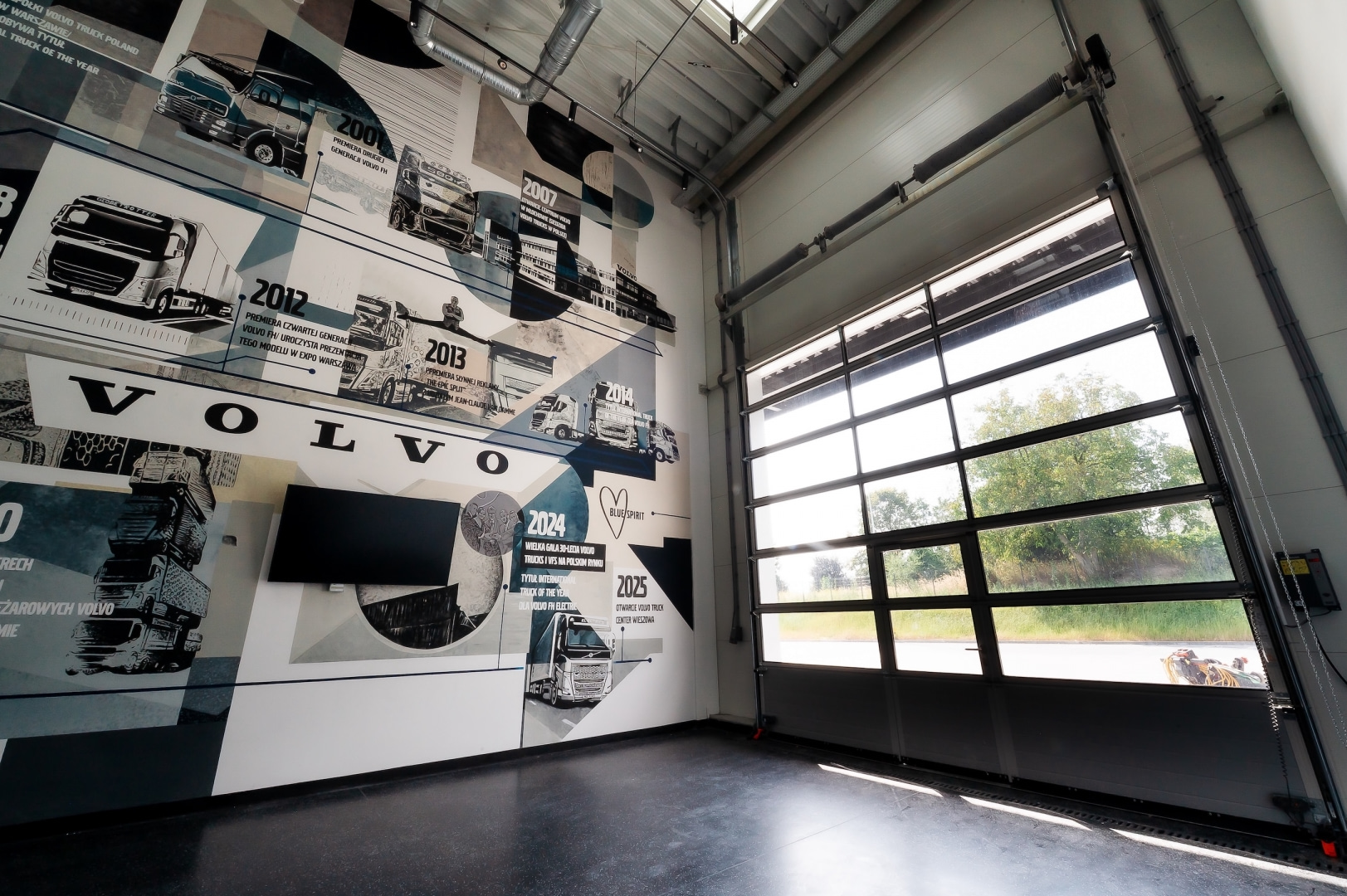 Jednym z najbardziej charakterystycznych elementów nowego centrum jest sala wydań samochodów, tzw. showroom. Multifunkcjonalne pomieszczenie o powierzchni 60 m², którego centralnym punktem jest mural o wysokości 9 metrów. To współczesna forma sztuki, symbolicznie łącząca ludzi, technologię i wartości Grupy Volvo. – Ten mural opowiada historię marki Volvo Trucks. Jej tradycję, wartości i wizję przyszłości. To symbol „toczenia się” i nieustającej podróży. Podróży w czasie, doświadczeniach, technologicznej zmianie, osiągnięciach i sukcesach– mówi arch. Izabela Sylwia Nowak. Połączenie części technicznej z reprezentacyjną wymagało jednak zachowania spójnego języka estetycznego. – To zawsze duże wyzwanie, by strefy serwisowe i biurowe harmonijnie współgrały. Ale Pani Izabeli udało się doskonale połączyć te dwa światy – podkreśla przedstawicielka Volvo Trucks.