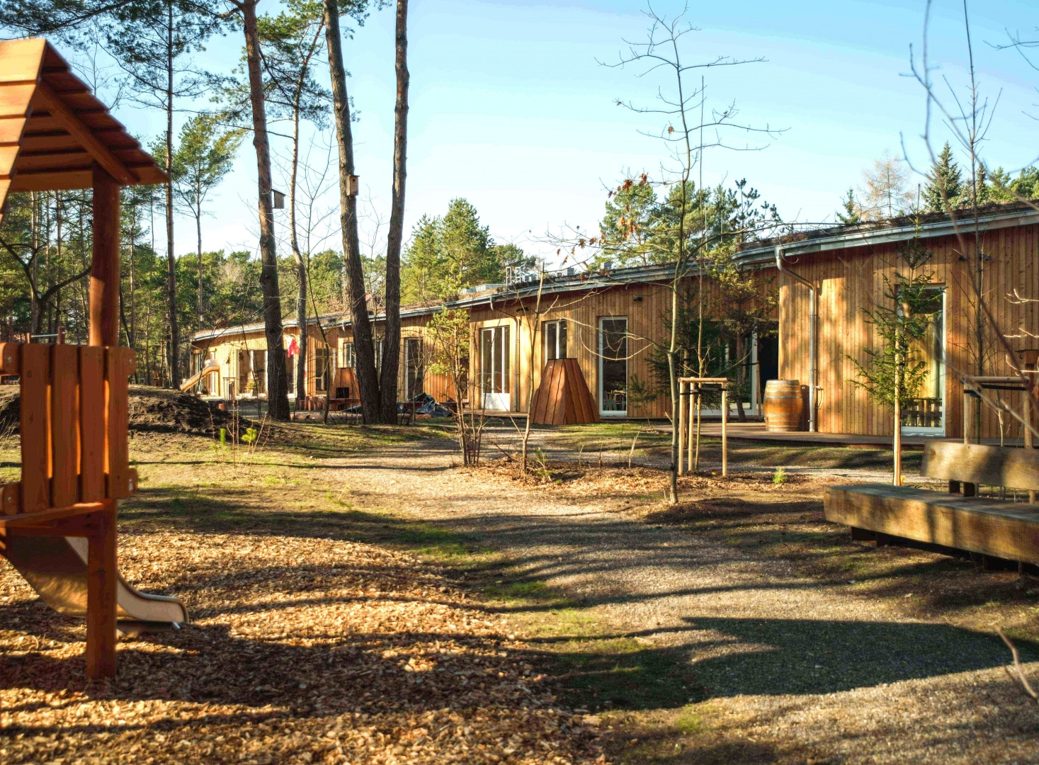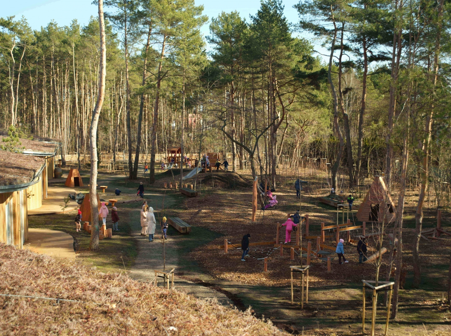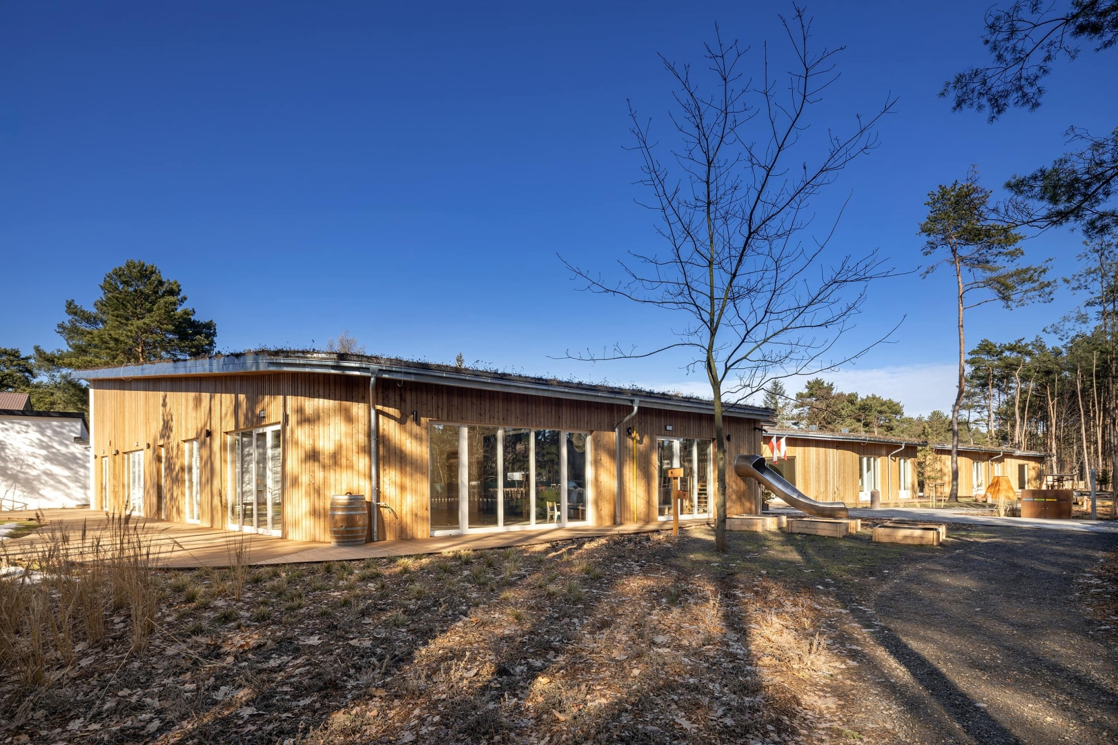 Budynek wkomponowano w istniejący drzewostan, ma też zielony dach z roślinami o powierzchni ponad 1500 m2. To nie tylko przykład zrównoważonego budownictwa, ale i nastawionego na bliskość natury systemu edukacji. Dzieci w czasie zabawy na zewnątrz mają naprawdę namacalny kontakt z naturą, a leśny charakter otoczenia pomaga uczyć najmłodszych bioróżnorodności i szacunku do przyrody. Wokół zaplanowano trzy strefy zabaw: są naturalne konstrukcje i leśny ogród, oddzielną część stanowi sfera edukacyjna z ogrodem warzywnym i hotelem dla owadów, całość dopełnia część sensoryczna ze ścieżką i funkcją wyciszenia.