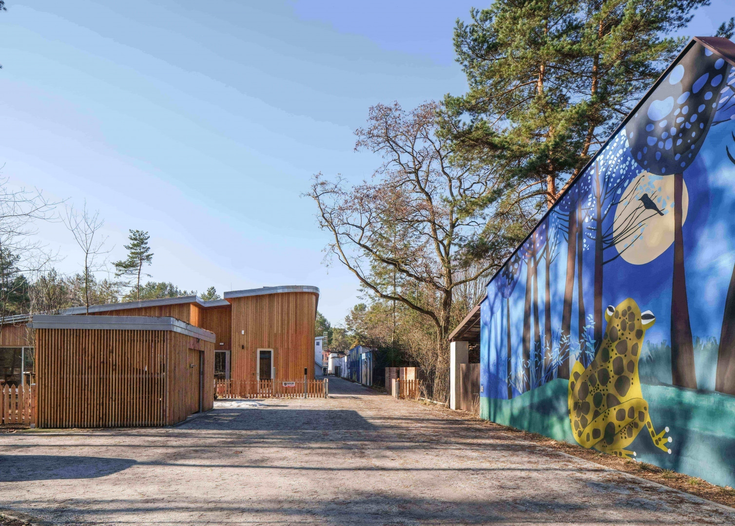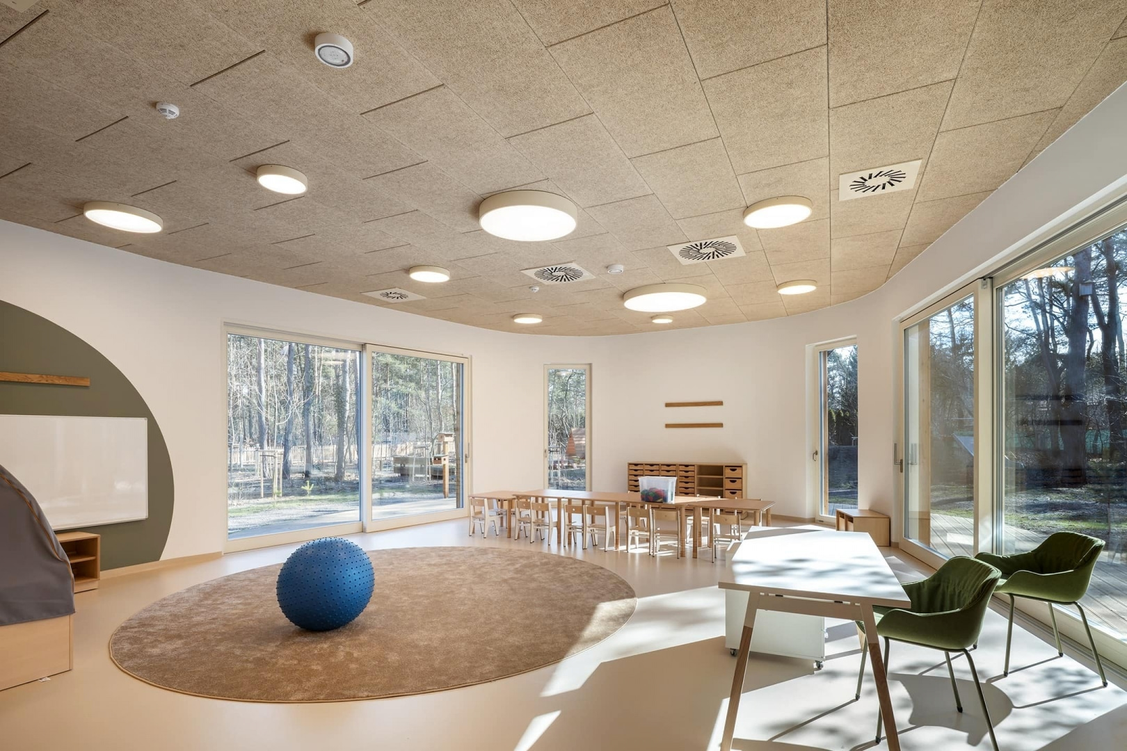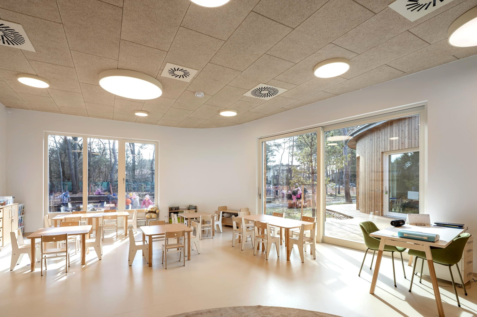 Budynek wkomponowano w istniejący drzewostan, ma też zielony dach z roślinami o powierzchni ponad 1500 m2. To nie tylko przykład zrównoważonego budownictwa, ale i nastawionego na bliskość natury systemu edukacji. Dzieci w czasie zabawy na zewnątrz mają naprawdę namacalny kontakt z naturą, a leśny charakter otoczenia pomaga uczyć najmłodszych bioróżnorodności i szacunku do przyrody. Wokół zaplanowano trzy strefy zabaw: są naturalne konstrukcje i leśny ogród, oddzielną część stanowi sfera edukacyjna z ogrodem warzywnym i hotelem dla owadów, całość dopełnia część sensoryczna ze ścieżką i funkcją wyciszenia.