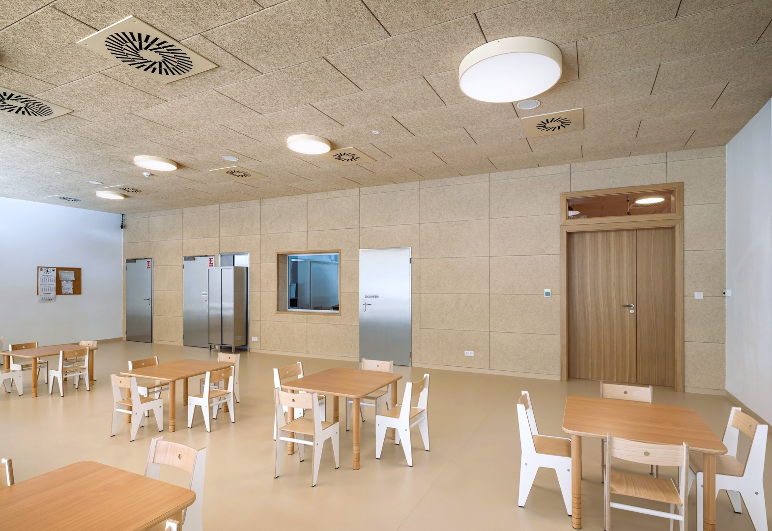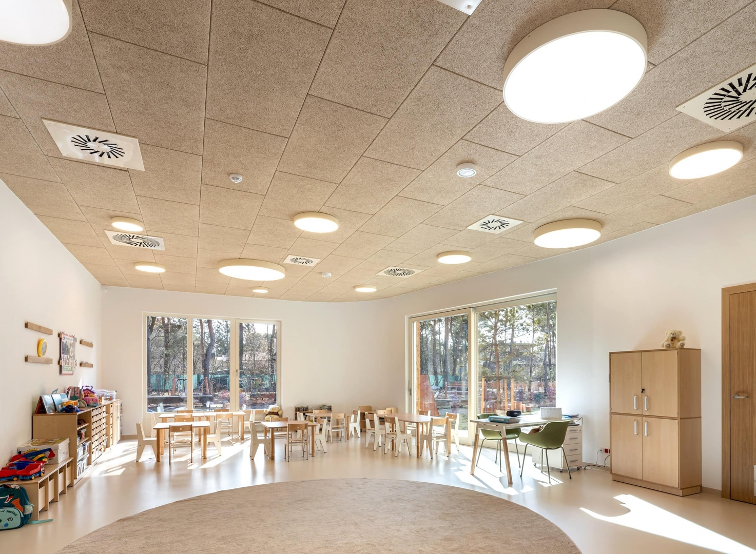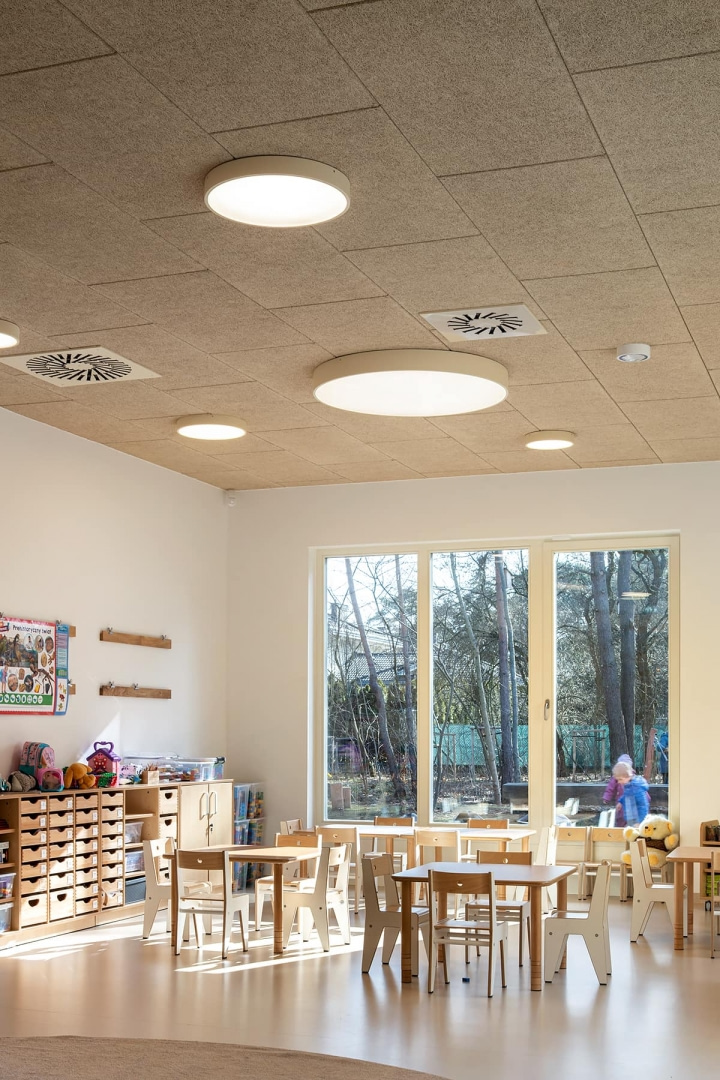 – Moduły Heradesign zamontowano nie tylko w salach zabaw, pomagają kształtować przyjazną akustykę także na korytarzu, w jadalni czy na sali, która służy do zajęć i przedstawień. W tym ostatnim pomieszczeniu panele dzięki klasie pochłaniania A powodują, że odbijające się w dużej przestrzeni głosy i dźwięki nie męczą, a słowa kierowane do dzieci są wyraźnie rozumiane – informuje Romuald Wilk, Wood Wool Heradesign Specification Manager z Knauf Ceiling Solutions.