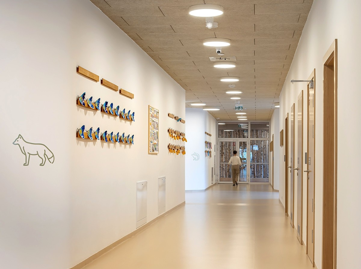Ściany na korytarzach zdobią białe pnie brzozy, owady i rysunki. Jedyne akcenty kolorystyczne to miękkie, zielone siedziska krzeseł kadry przedszkolnej, no i same dzieci, bez ich energii i kolorowych strojów przedszkole straciłoby duszę. W ciągu dnia w 5 salach przebywa tu blisko 130 maluchów. Choć obiekt jest placówką edukacyjną, patrząc na jego design i otoczenie w zasadzie można by powiedzieć, że dzieci są codziennie na obozie skautów wśród natury. Dzięki pracy architektów oraz inwestora, którym jest miasto Józefów, nie musimy już wskazywać, że w Skandynawii mają najfajniejsze placówki, przedszkole leśne mamy już też w Polsce.