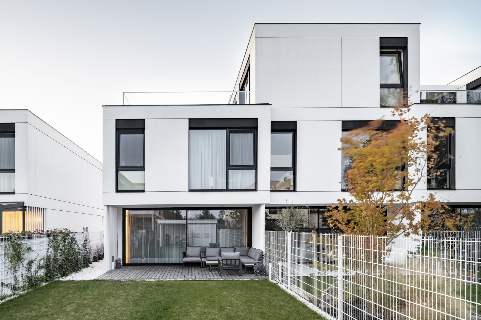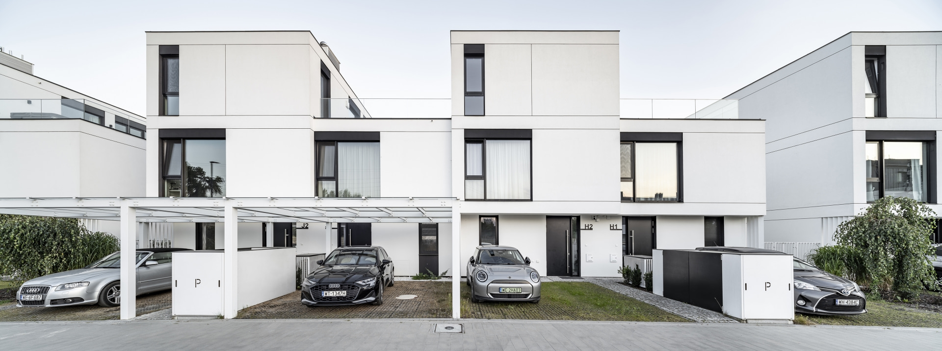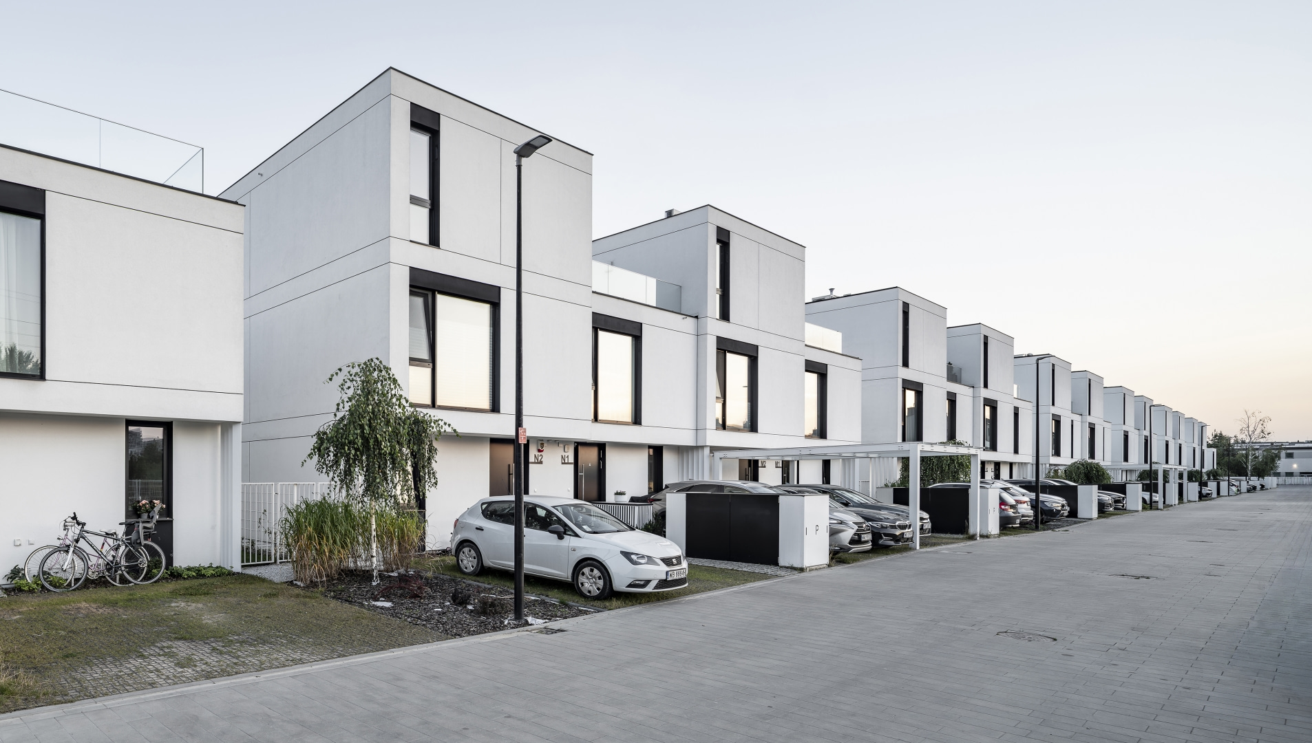 – Wyraz tektoniczny budynków kształtują wzajemne przesunięcia parteru i piętra, nadające bryłom dynamikę oraz subtelne zróżnicowanie przestrzenne. Wnętrza o wysokości 2,7 m oraz w pełni przeszklone ściany salonów z systemem przesuwnym HS budują relację pomiędzy domem a ogrodem – podkreśla Michał Wądołowski.