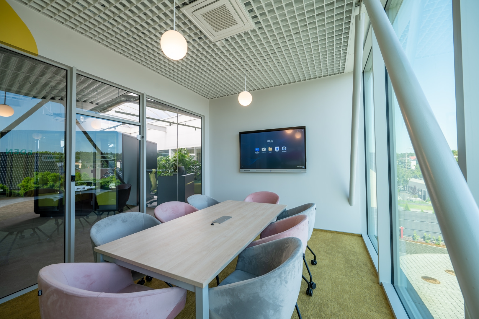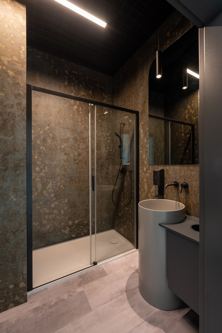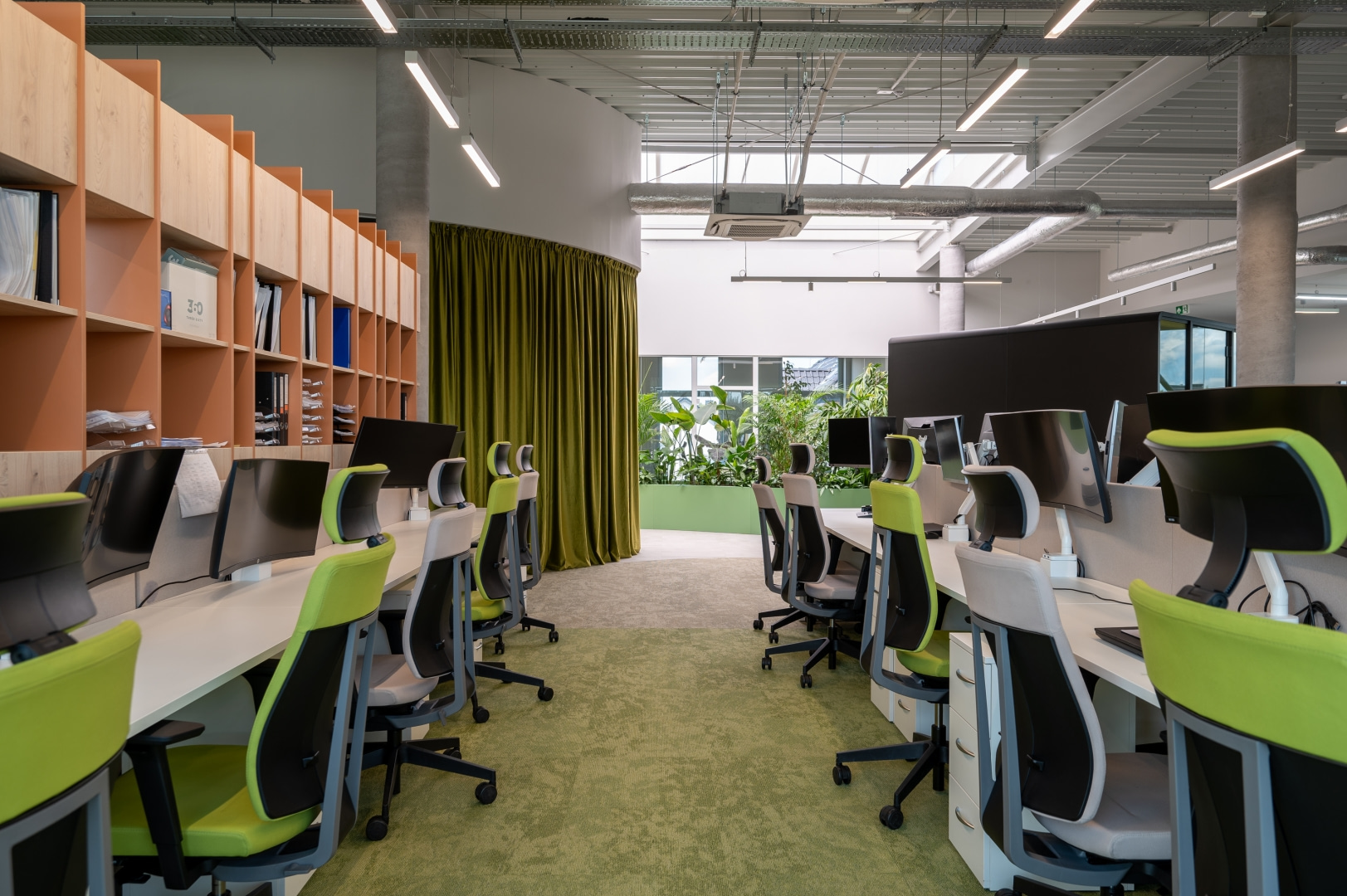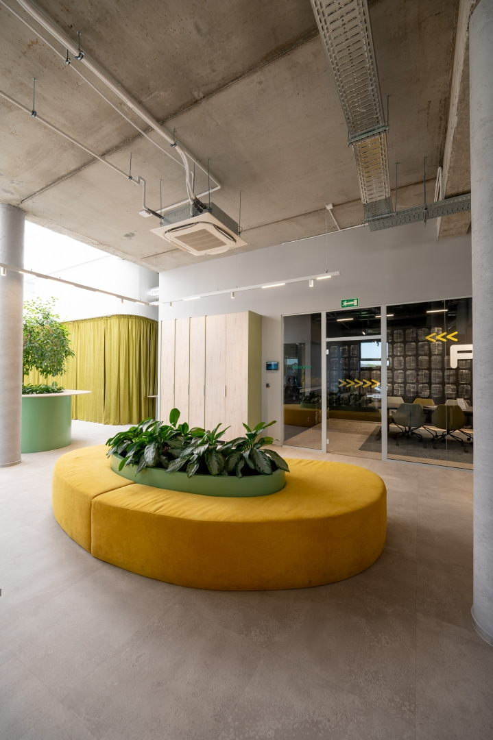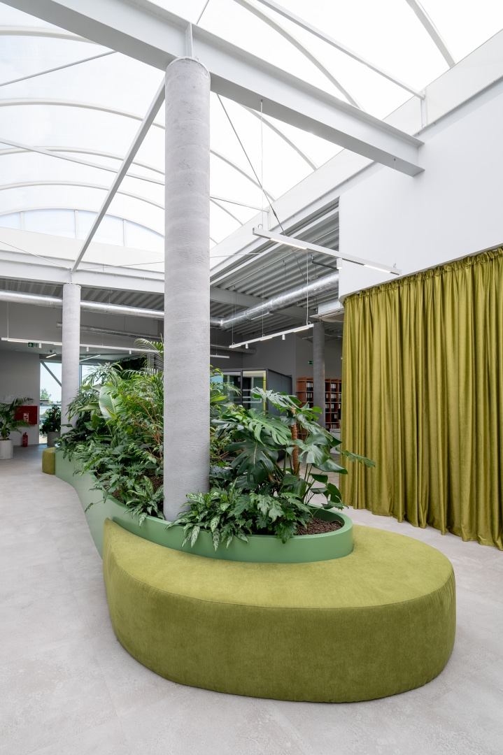 Istotnym elementem kompozycji wnętrz jest kontrast materiałowy. Surowe betonowe ściany i stropy zestawiono z miękkimi teksturami, naturalnym światłem oraz intensywną zielenią roślin. Wprowadzenie elementów biophilic design pozwoliło uzyskać efekt równowagi między technologicznym charakterem miejsca a potrzebą kontaktu z naturą.