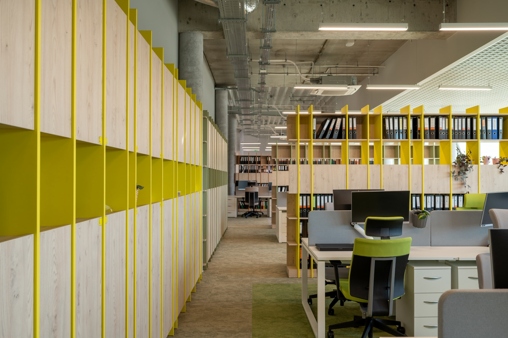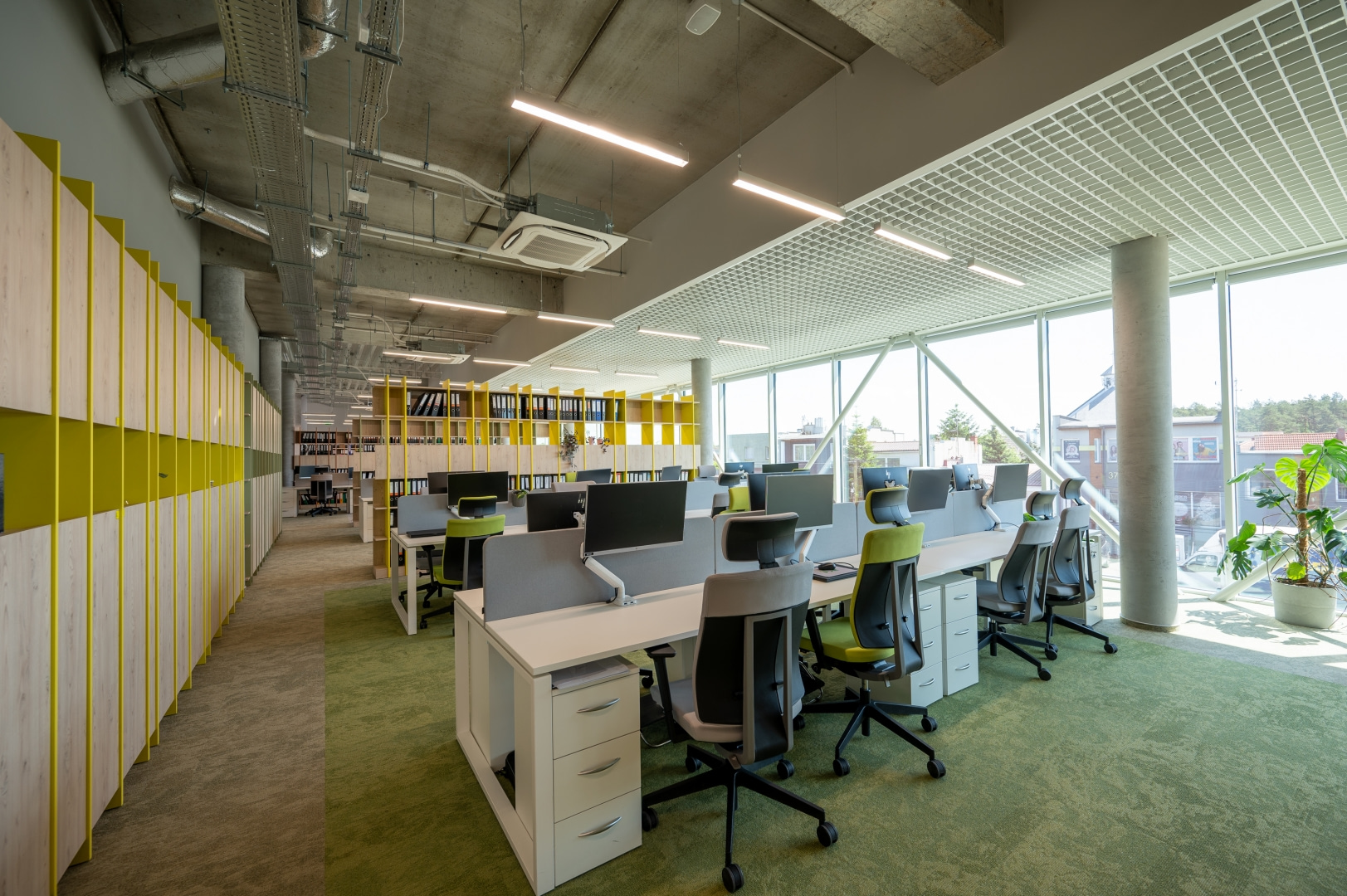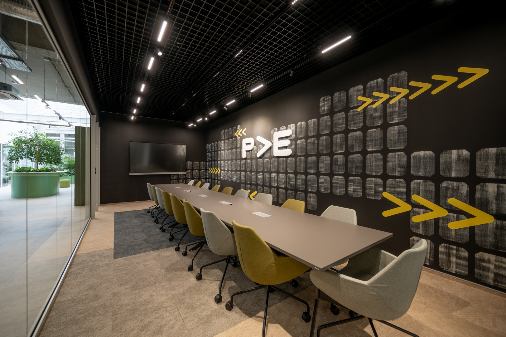 Istotnym elementem kompozycji wnętrz jest kontrast materiałowy. Surowe betonowe ściany i stropy zestawiono z miękkimi teksturami, naturalnym światłem oraz intensywną zielenią roślin. Wprowadzenie elementów biophilic design pozwoliło uzyskać efekt równowagi między technologicznym charakterem miejsca a potrzebą kontaktu z naturą.