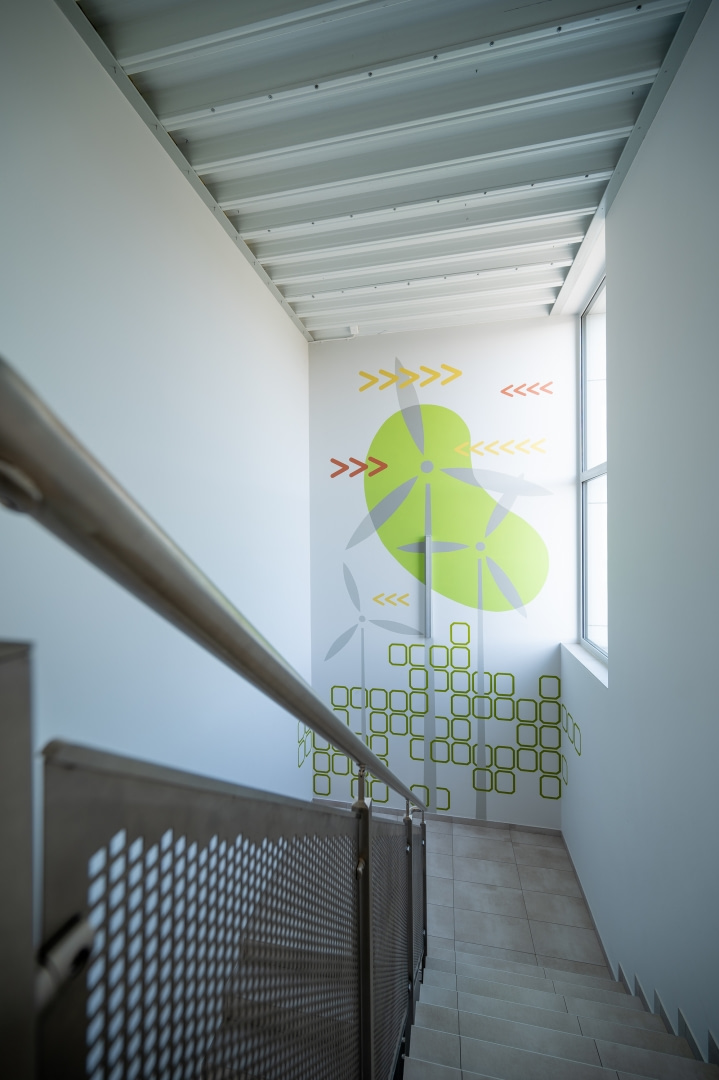 Warstwa wizualna projektu została wzbogacona o autorskie motywy graficzne oraz świadomie dobraną paletę materiałów i kolorów. Subtelne odniesienia do energetyki odnawialnej widoczne są w fakturach inspirowanych powierzchnią paneli fotowoltaicznych oraz w organicznych detalach nawiązujących do naturalnych procesów. Dzięki temu przestrzeń zyskuje dodatkowy wymiar narracyjny – staje się fizycznym odzwierciedleniem misji firmy.