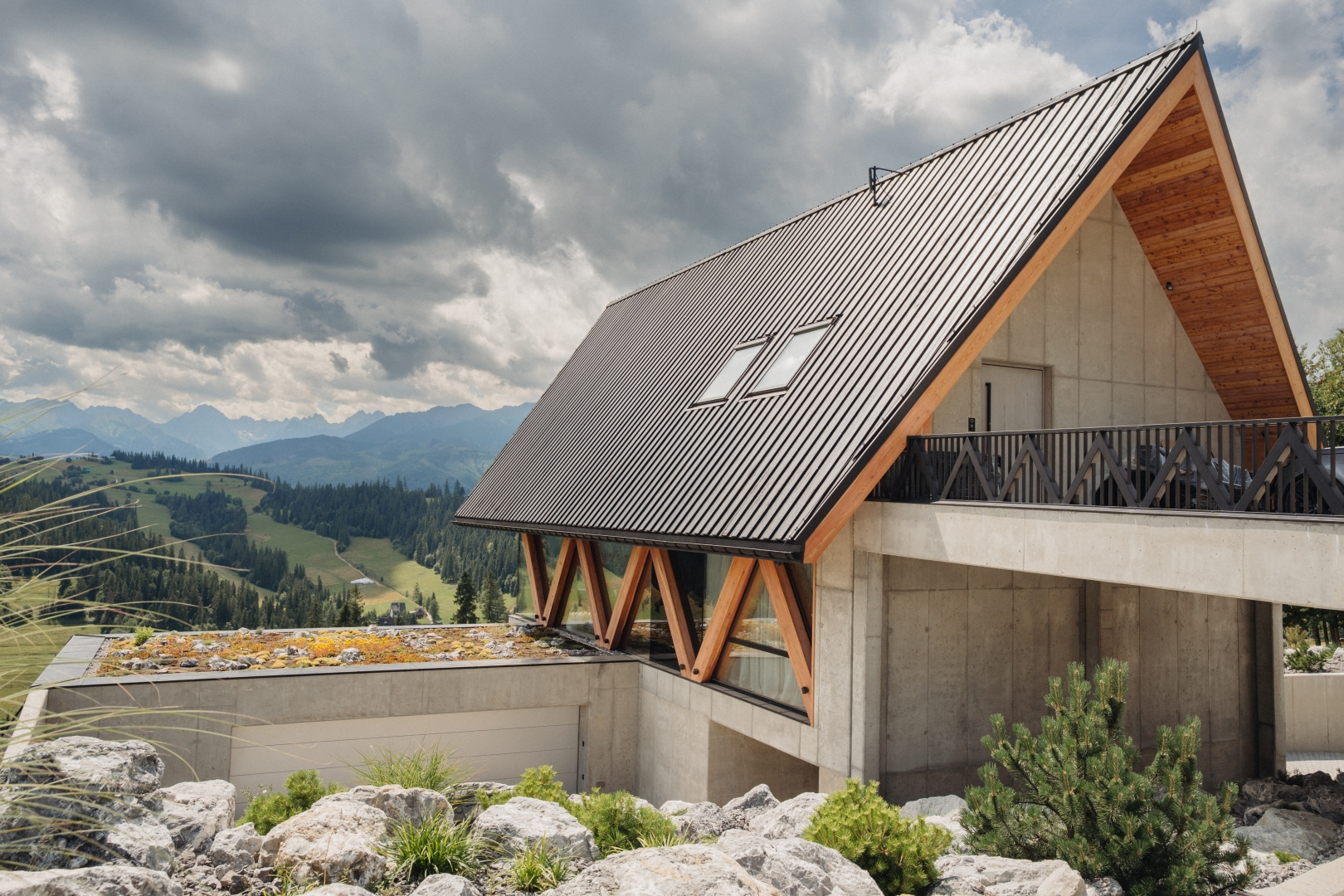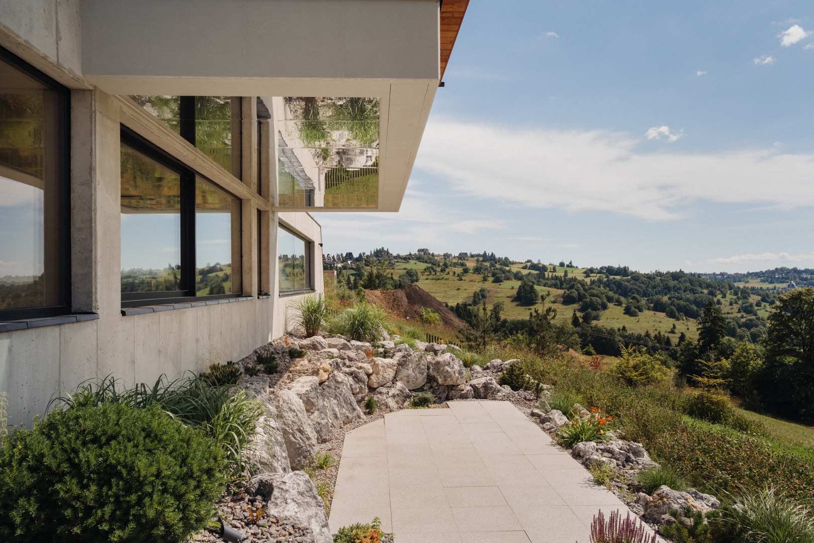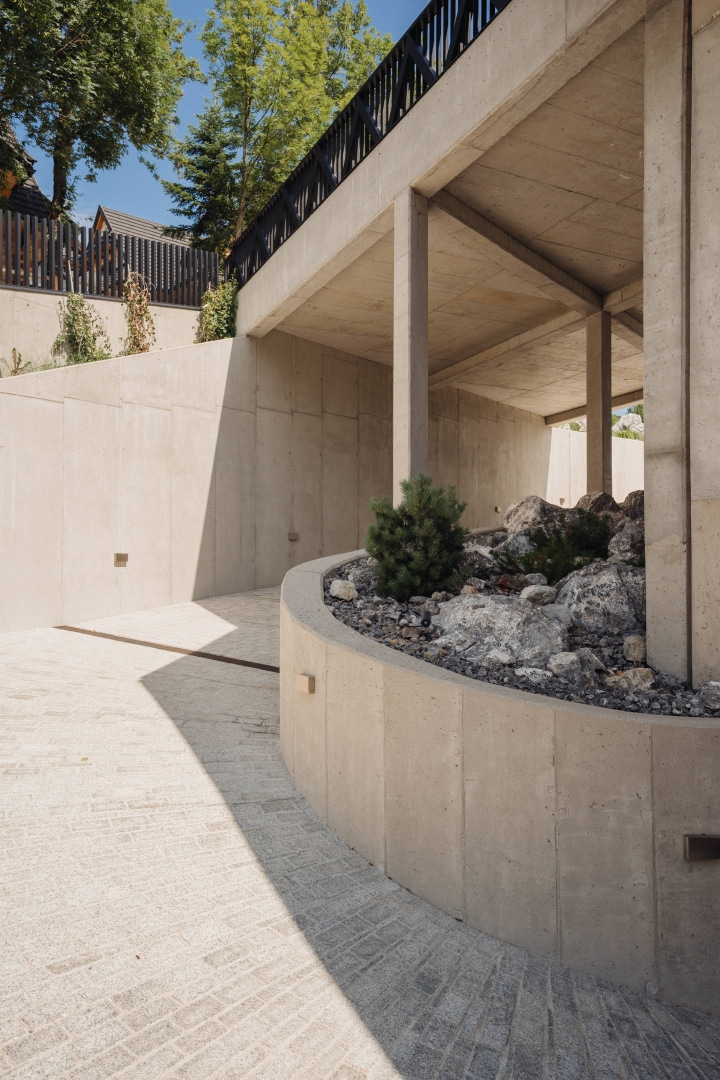 Ogród w większości pozostawiono w formie naturalnej łąki. Bezpośrednio przy domu ukształtowano przestrzeń inspirowaną wysokogórskimi halami – rumowiska skalne i piargi obsadzono rodzimą roślinnością górską. Kamień naturalnie koresponduje z betonowymi ścianami przyziemia i murami oporowymi, które były konieczne ze względu na poprowadzenie drogi dojazdowej.