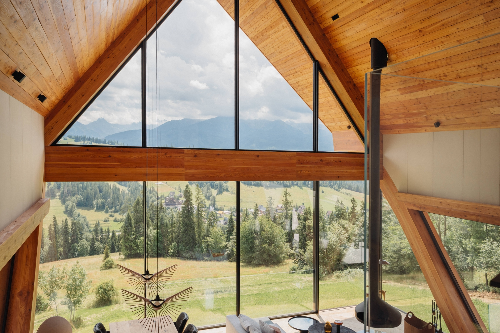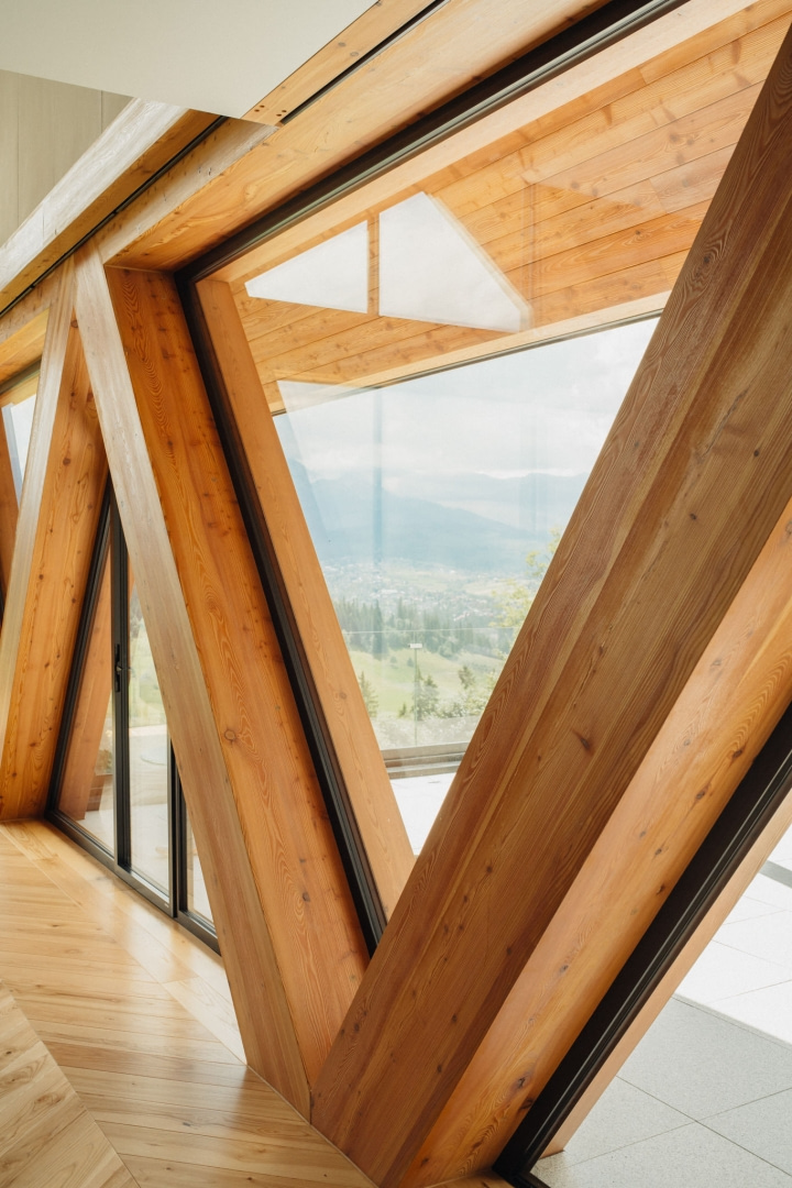 Układ funkcjonalny domu podporządkowano relacji z otoczeniem. W przyziemiu zlokalizowano garaż, pomieszczenia techniczne oraz rozbudowaną strefę SPA z sauną, jacuzzi, przestrzenią relaksu i siłownią. Parter mieści strefę dzienną – salon z kuchnią oraz dwie sypialnie. Salon otwiera się przez dwie kondygnacje aż do kalenicy dachu, co potęguje wrażenie przestrzeni i pozwala w pełni doświadczyć panoramy gór.