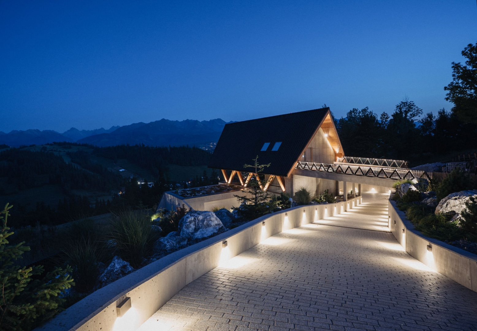 Kładka pełni jednocześnie funkcję komunikacyjną i użytkową. Może służyć jako dodatkowe miejsce postojowe dla samochodów. Droga dojazdowa do garażu zakręca pod bryłą budynku. Wjazd do garażu jest doświadczeniem samym w sobie, za bramą otwiera się duże przeszklenie kadrujące panoramę Tatr, oferujące widok, który zazwyczaj zarezerwowany jest dla stref dziennych domu