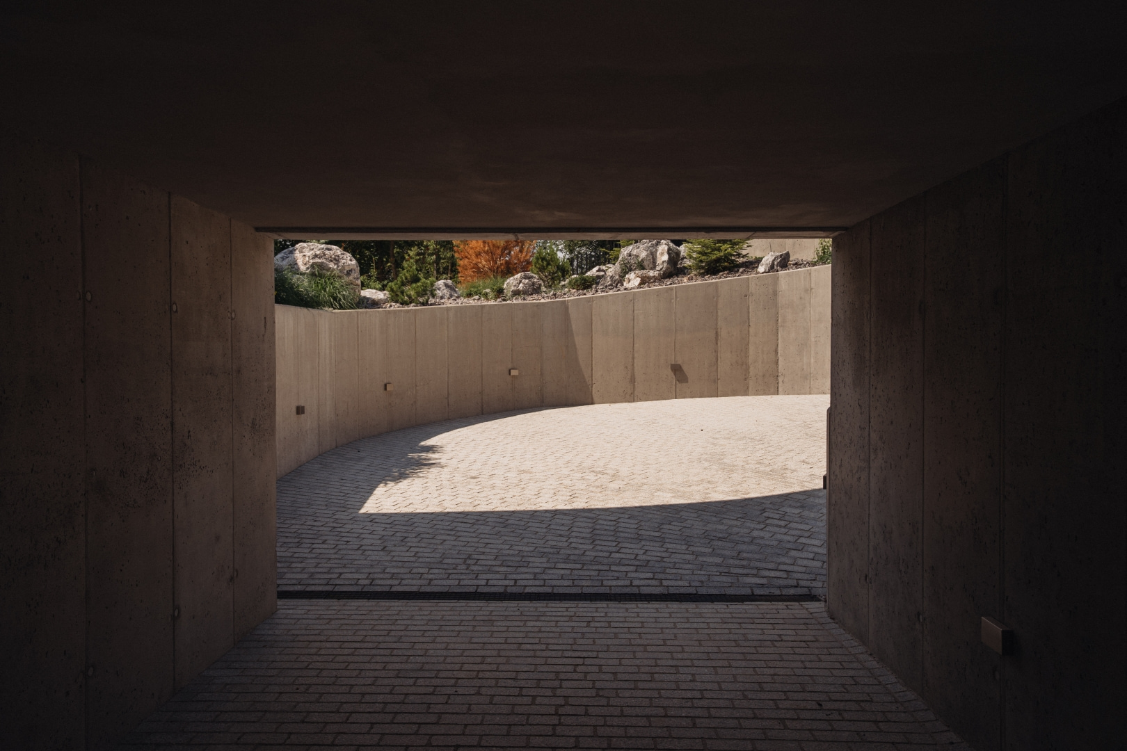 Przyziemie wykonano w całości z betonu, także jako materiału konstrukcyjnego. Betonowe ściany piwnic pełnią funkcję ścian dociskowych i murów oporowych, nie tracąc przy tym wymaganych parametrów cieplnych. Surowość betonu zestawiono z ciepłem drewna i transparentnością szkła, tworząc wyraźny kontrast pomiędzy masywną podstawą a lżejszą górną kondygnacją.
