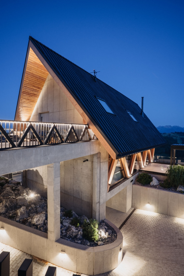Od północy dom zamyka się minimalistyczną, betonową elewacją, chroniąc mieszkańców przed spojrzeniami sąsiadów. Od południa, wschodu i zachodu otwiera się natomiast na niesamowitą panoramę Tatr oraz własny teren inwestorów, zapewniając pełną intymność.
